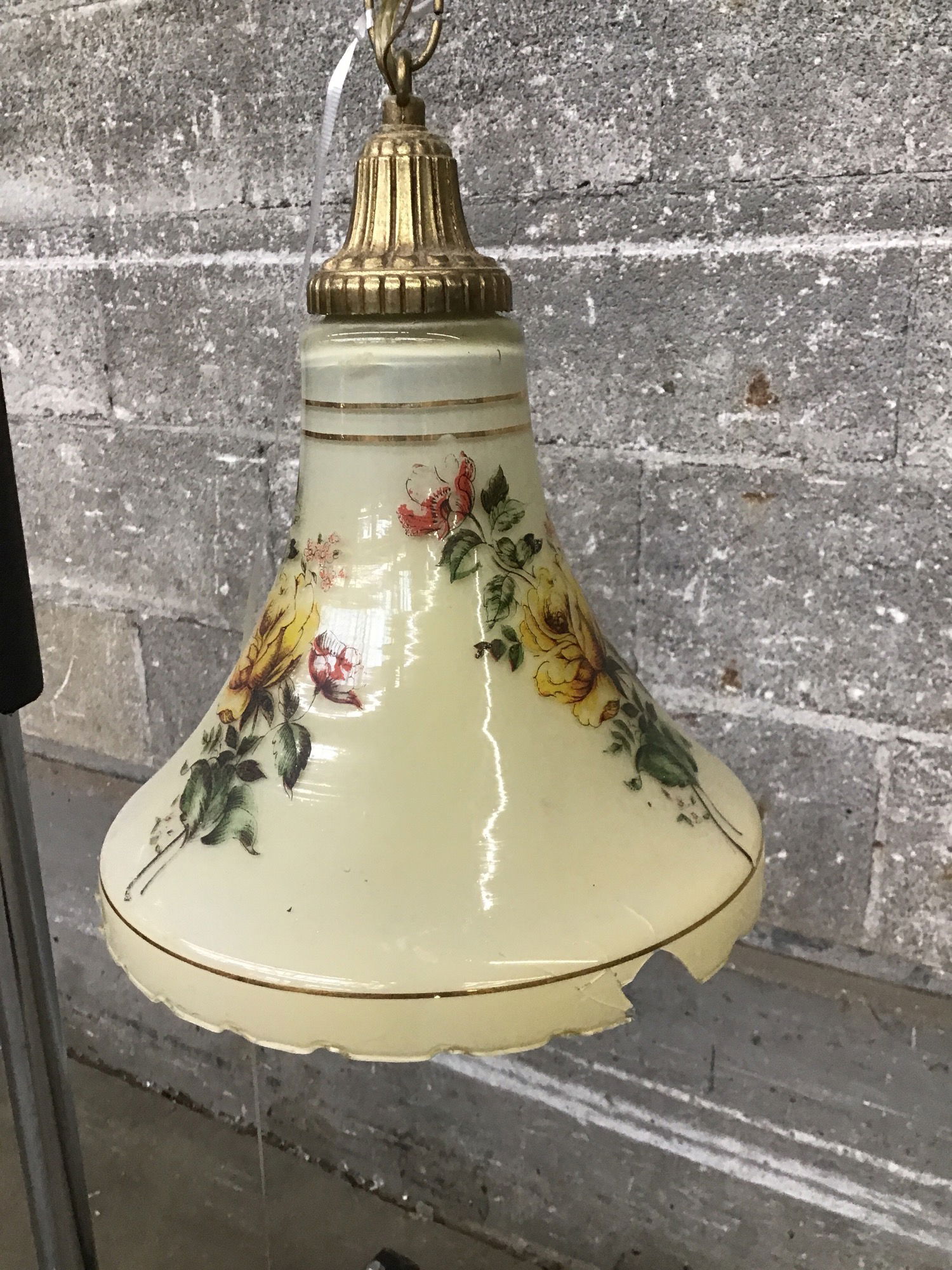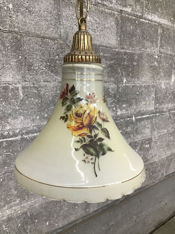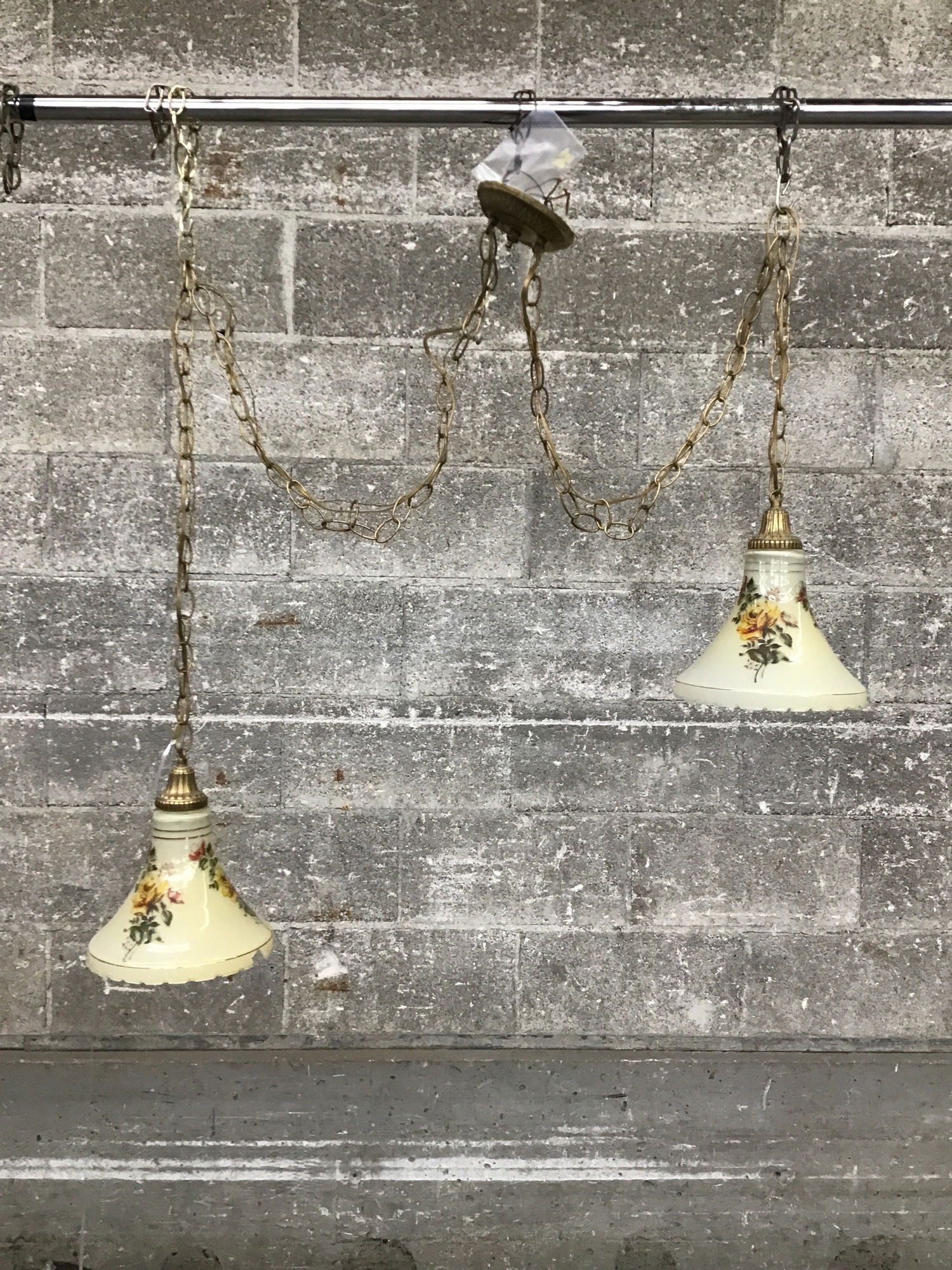 This vintage double swag light featuring two bell shaped, floral painted shades basically embodies afternoon tea with Granny. There is a tiny chip on the edge of one shade. The chipped pieces have all been bagged up and ziptied to the canopy, so if you have a steady hand with glue you could make that chip way less obvious. Price reflects regardless. Width listed is for each shade.
