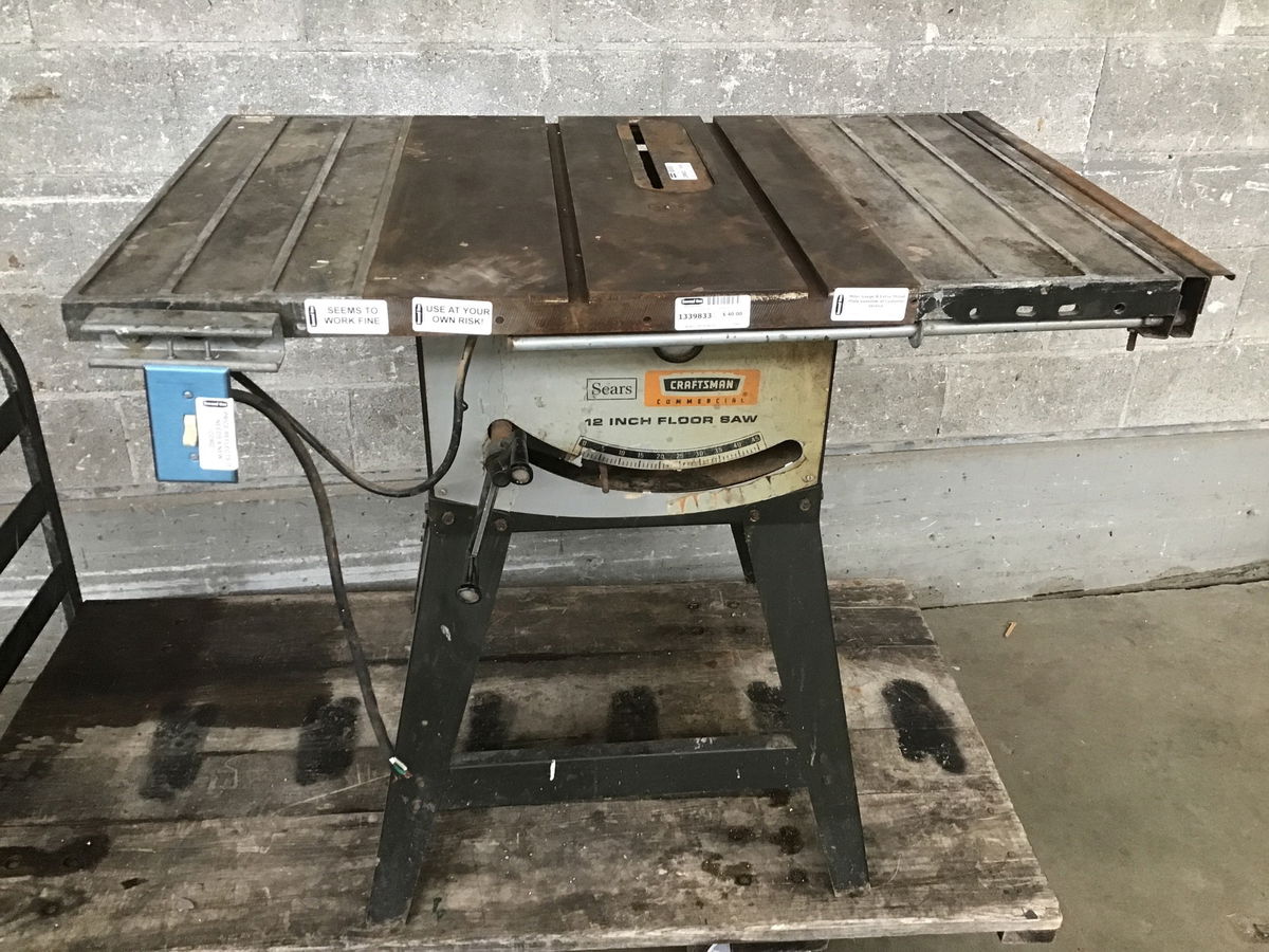 This Craftsman "Commercial 12" Floor Saw" table saw ran fine when I wired it up, but it was in a garage fire and the cord had to be cut off to remove. Price reflects you'll need to wire on a new cord. Comes with a miter gauge and extra throat plate, but no fence.