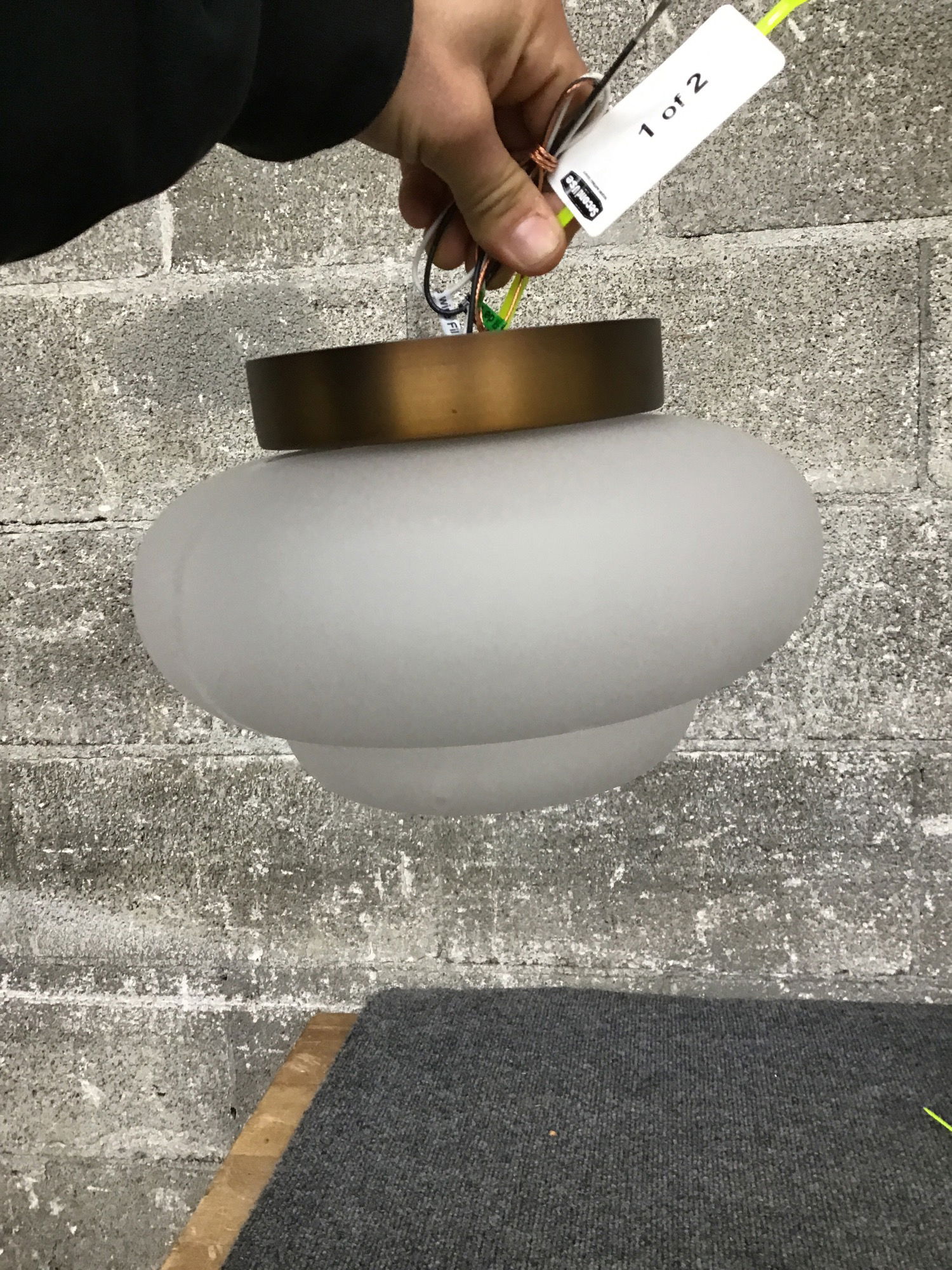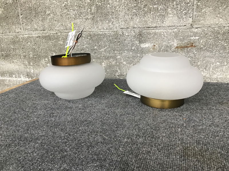 A pair of modern bathroom sconces from Crate and Barrel. They feature frosted opaque glass shades, an aged brass look on the frame and are suitable for damp locations. These would make great for about any bathroom.