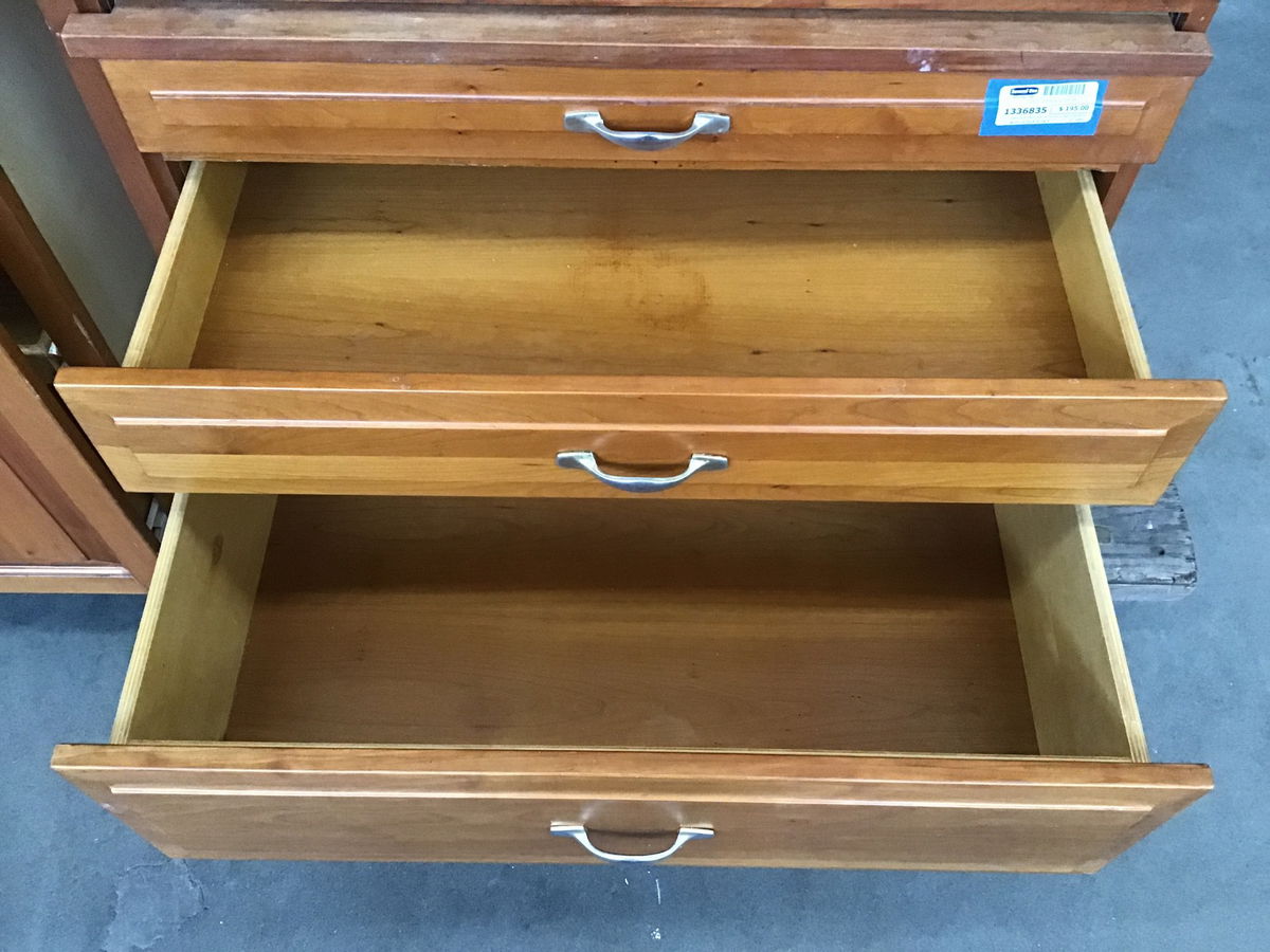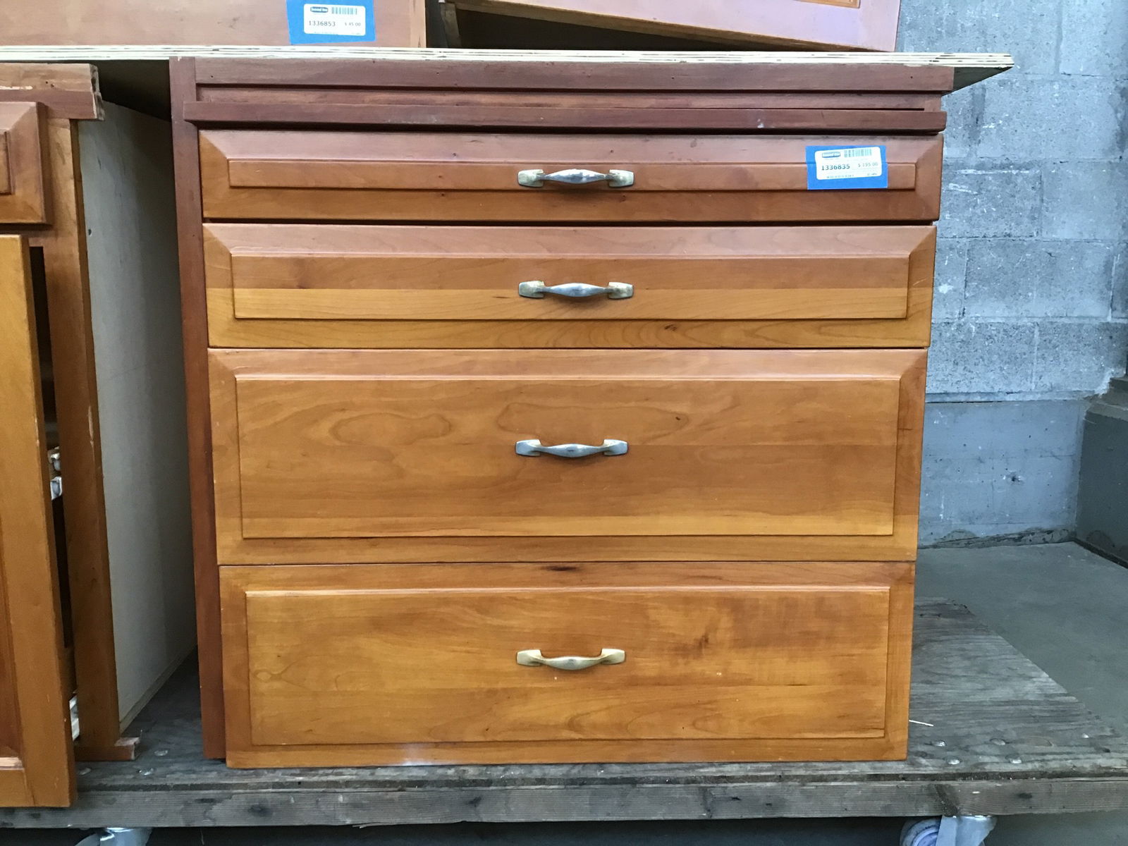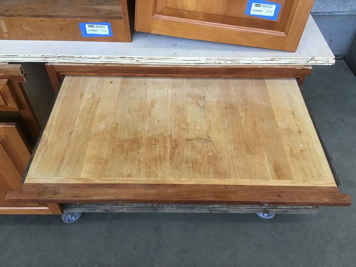 Custom built Cherry base cabinet that is ready to be retired to shop status, overall it is well-built, just a little tired, includes an enormous cutting board.