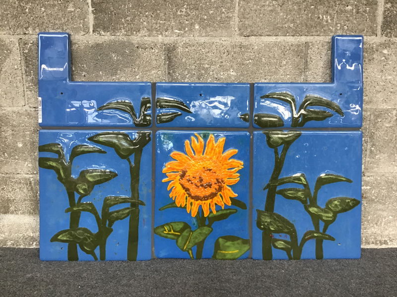 Custom glass tile backsplash featuring a cheerful sunflower and some friendly stalks, already has some holes drilled making this an easy plug and play update to your kitchen. It needs a good scrub.