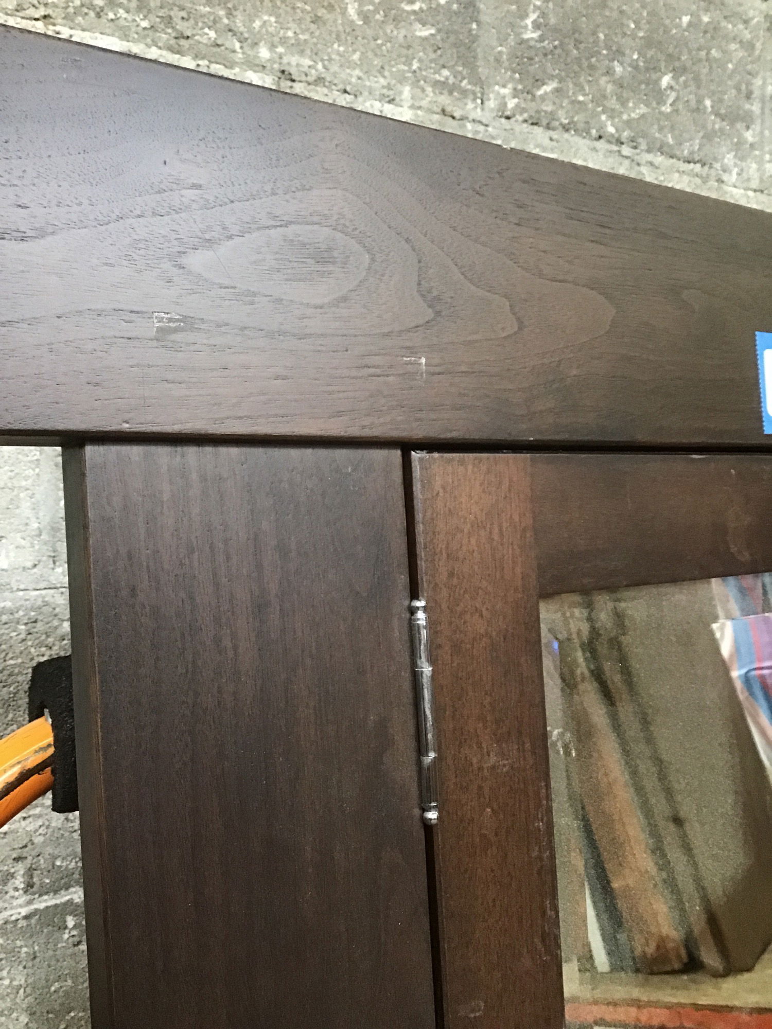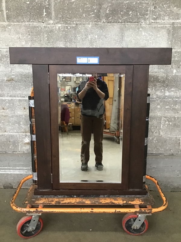 This is a beautiful and well built custom made medicine cabinet made entirely from walnut. The mirror in the door has an exquisite bevel and behind the door is a large area for storing bathroom items. Comes with 6 glass shelves and you will need to source your own shelf pegs. If you asked nice, we might even just give you some.