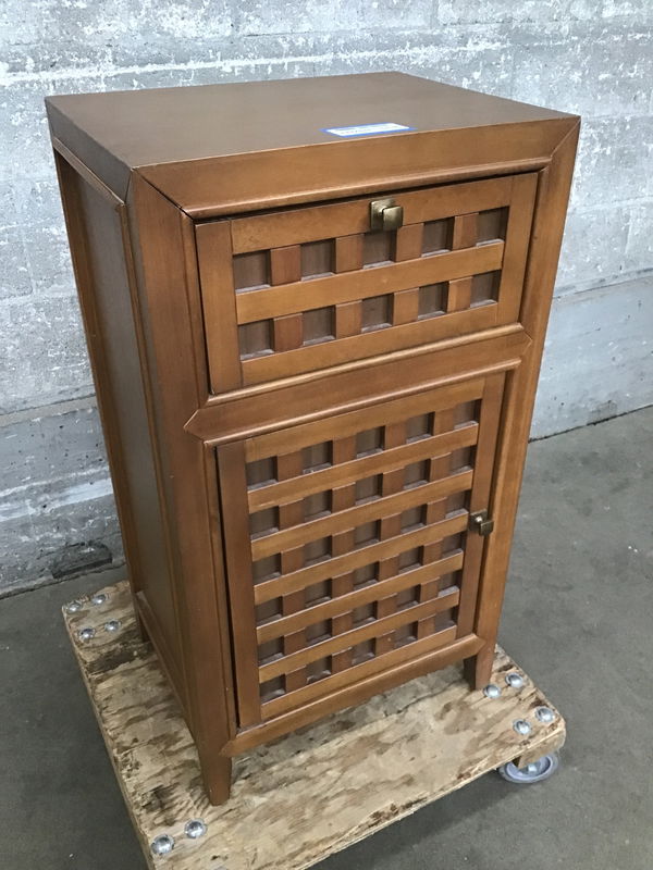 This is a small and clean teak side table with a waffle pattern wooden face on the drawer and the door.