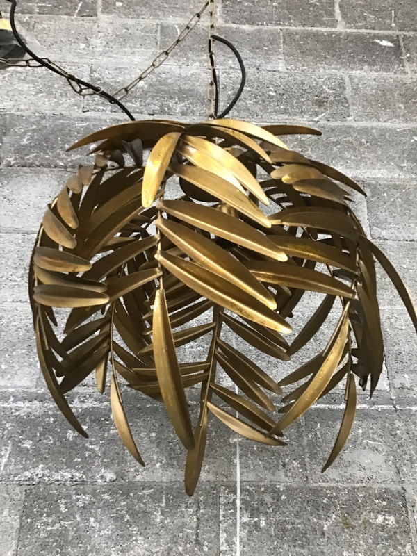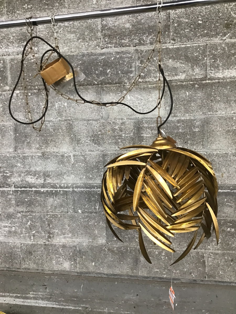This Cyan Design (#10563) "Palma chain pendant is just out of box, but lost a couple "leaves" on it way out of the box. Come with a bag of extras. Dimensions are approximate. Has ~90" of chain & cord above height of fixture listed. The 17" option of this unit is still available online for $526.