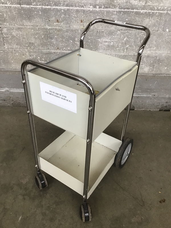 This is a steel library cart with an extra deep portion at the top and a shallower one under it. Rolls on 4 wheels.