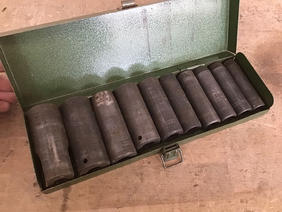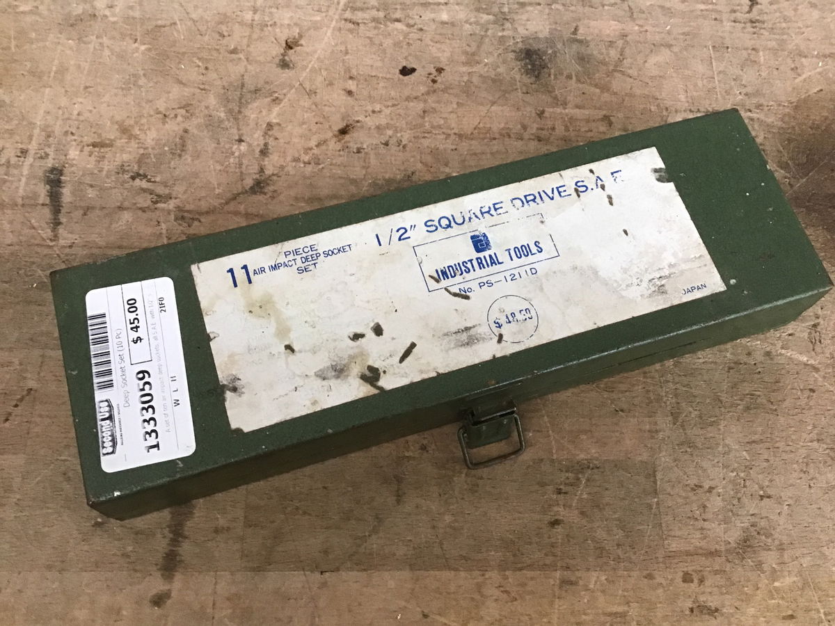 A set of ten air impact deep sockets, all S.A.E. with 1/2" square drives, all in a green steel case.