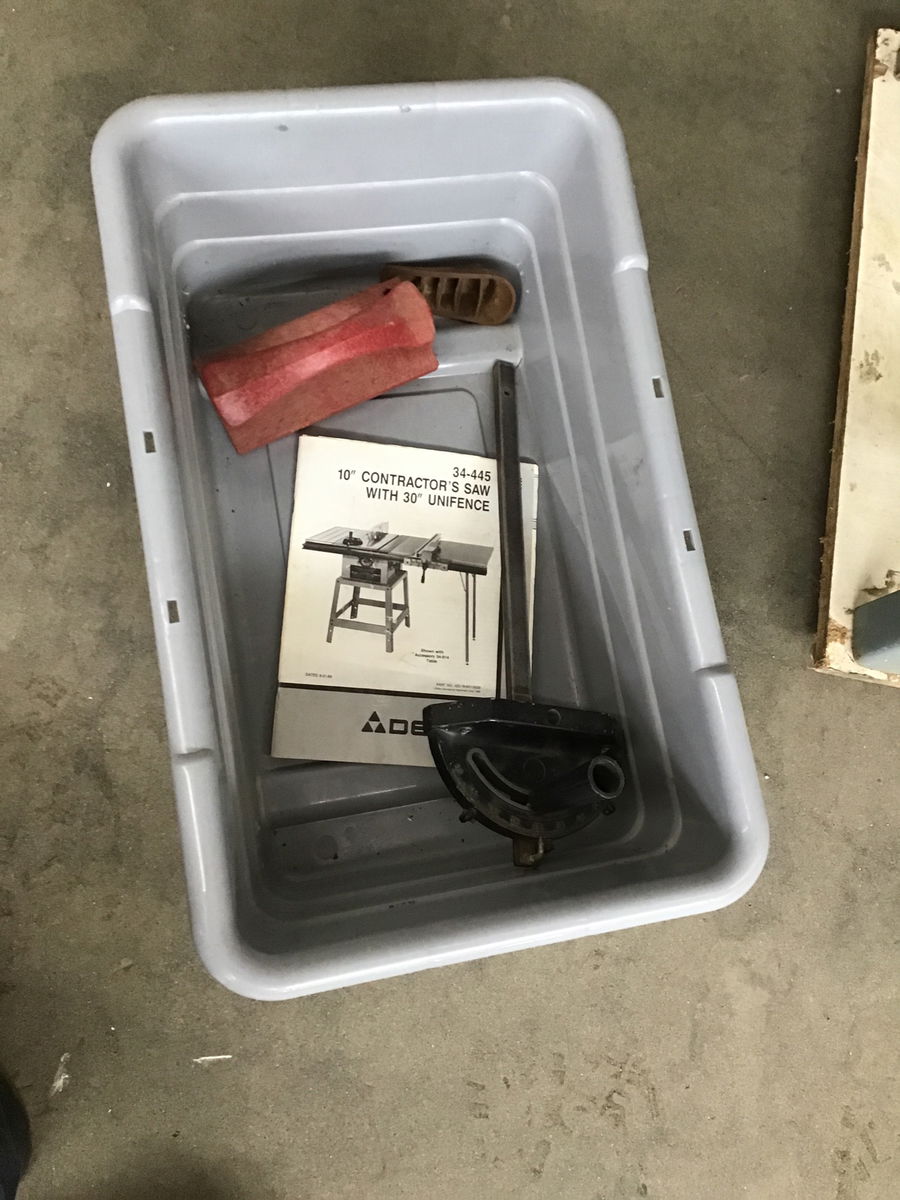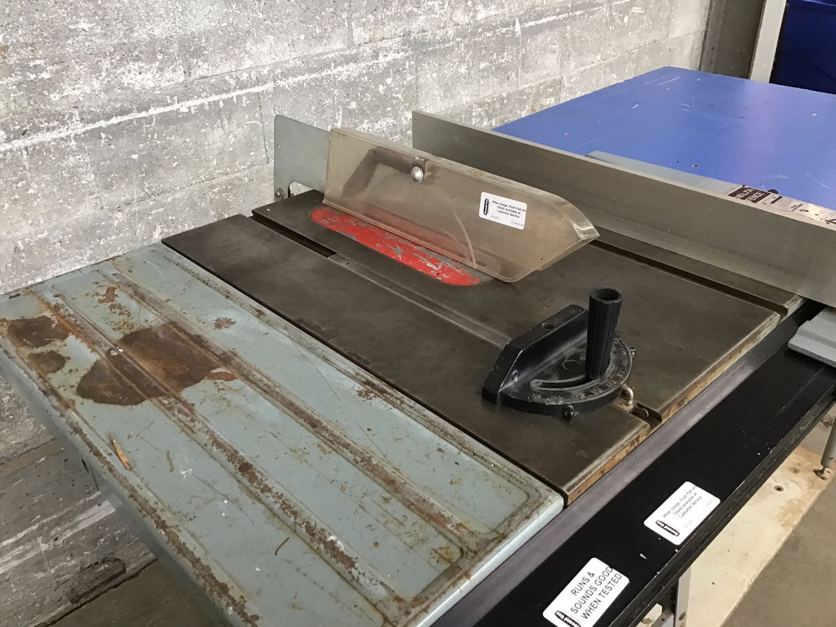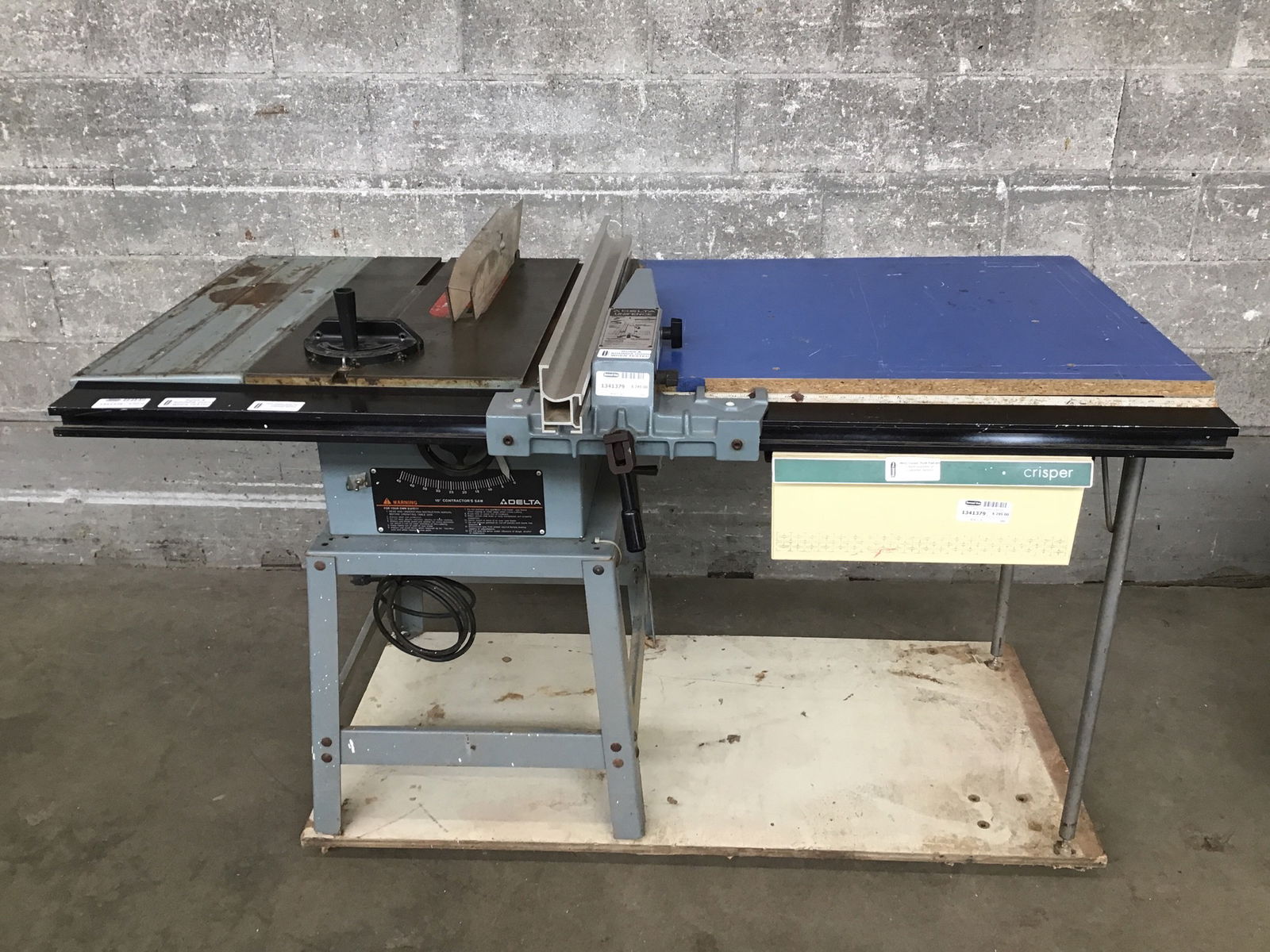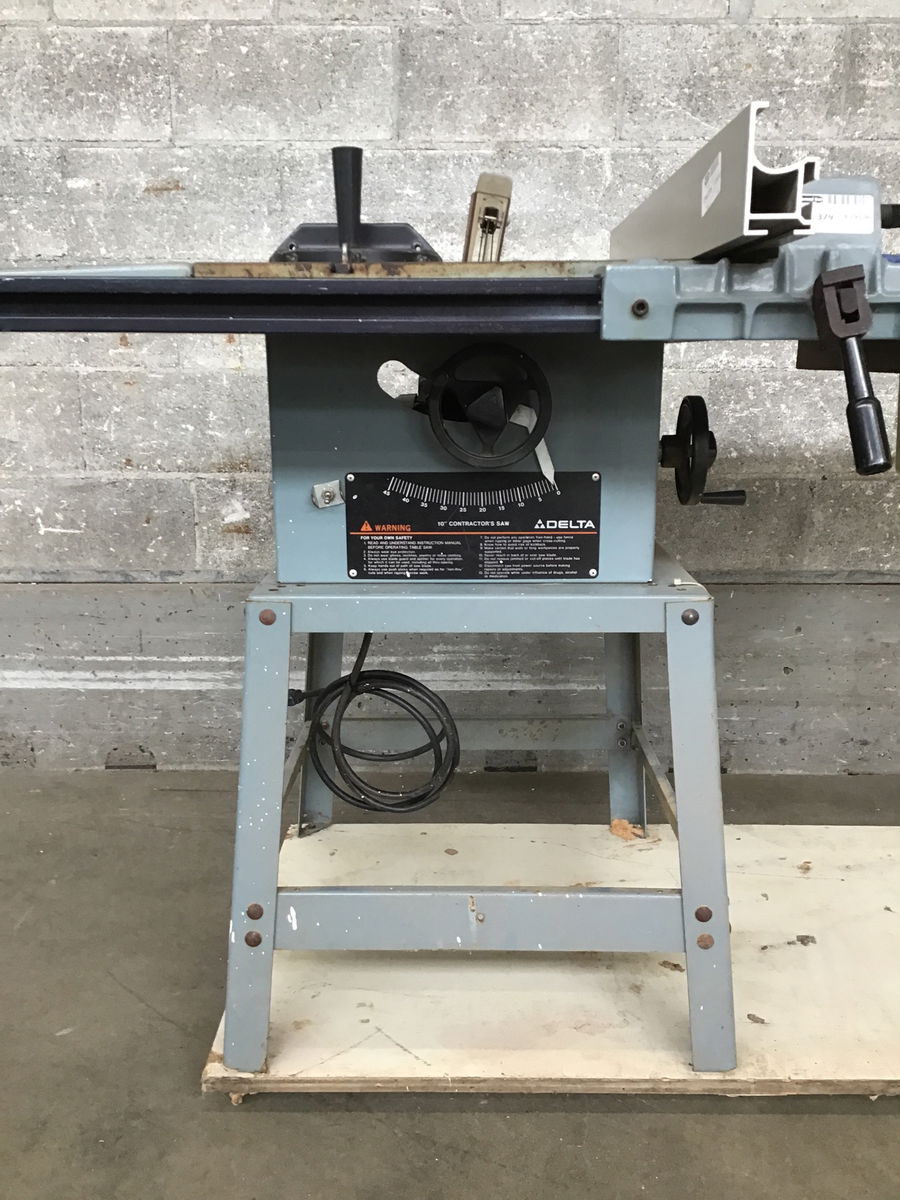 Delta 10" Contractor's table saw with Delta Unifence and right side extension all mounted on a platform with short "ball" style casters underneath it. Ran like a champ when plugged into a 120 volt outlet.