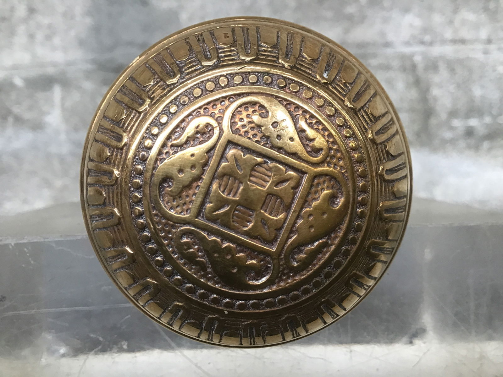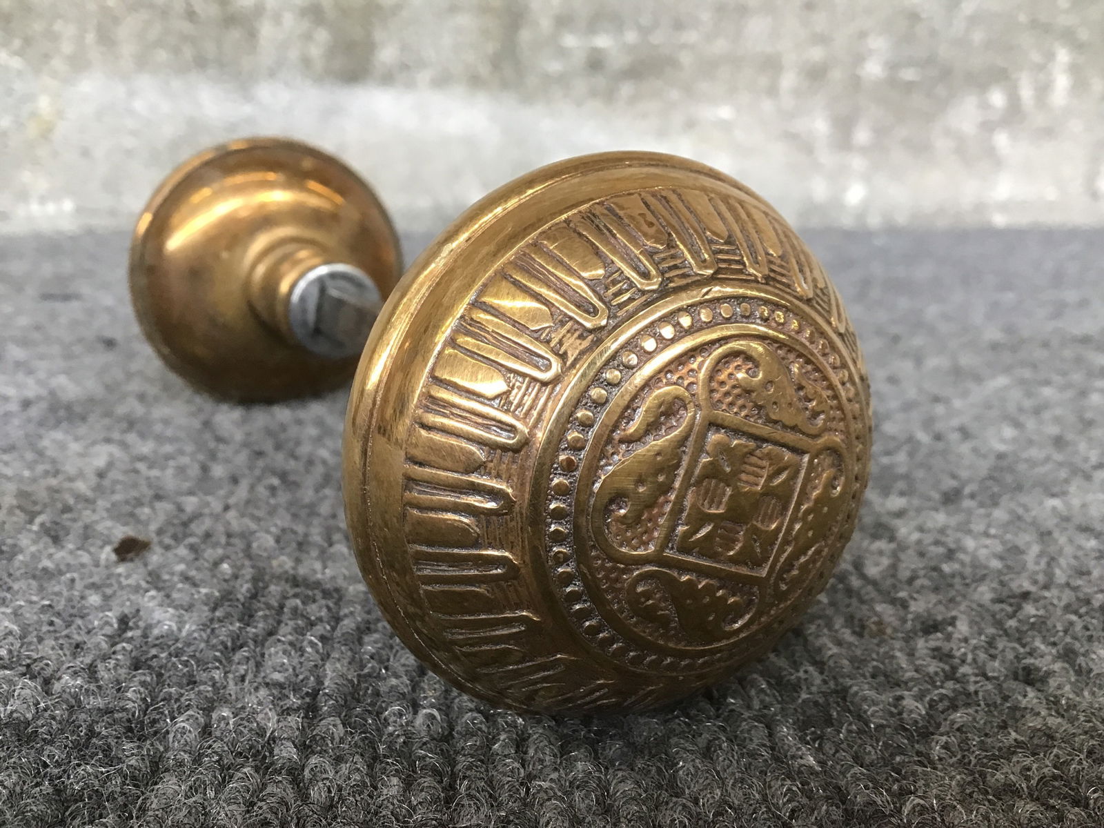 Stamped brass Eastlake style knobset with signature floral and geometric designs. Fairly certain this is a reproduction, but it's probably old enough to be considered vintage regardless.