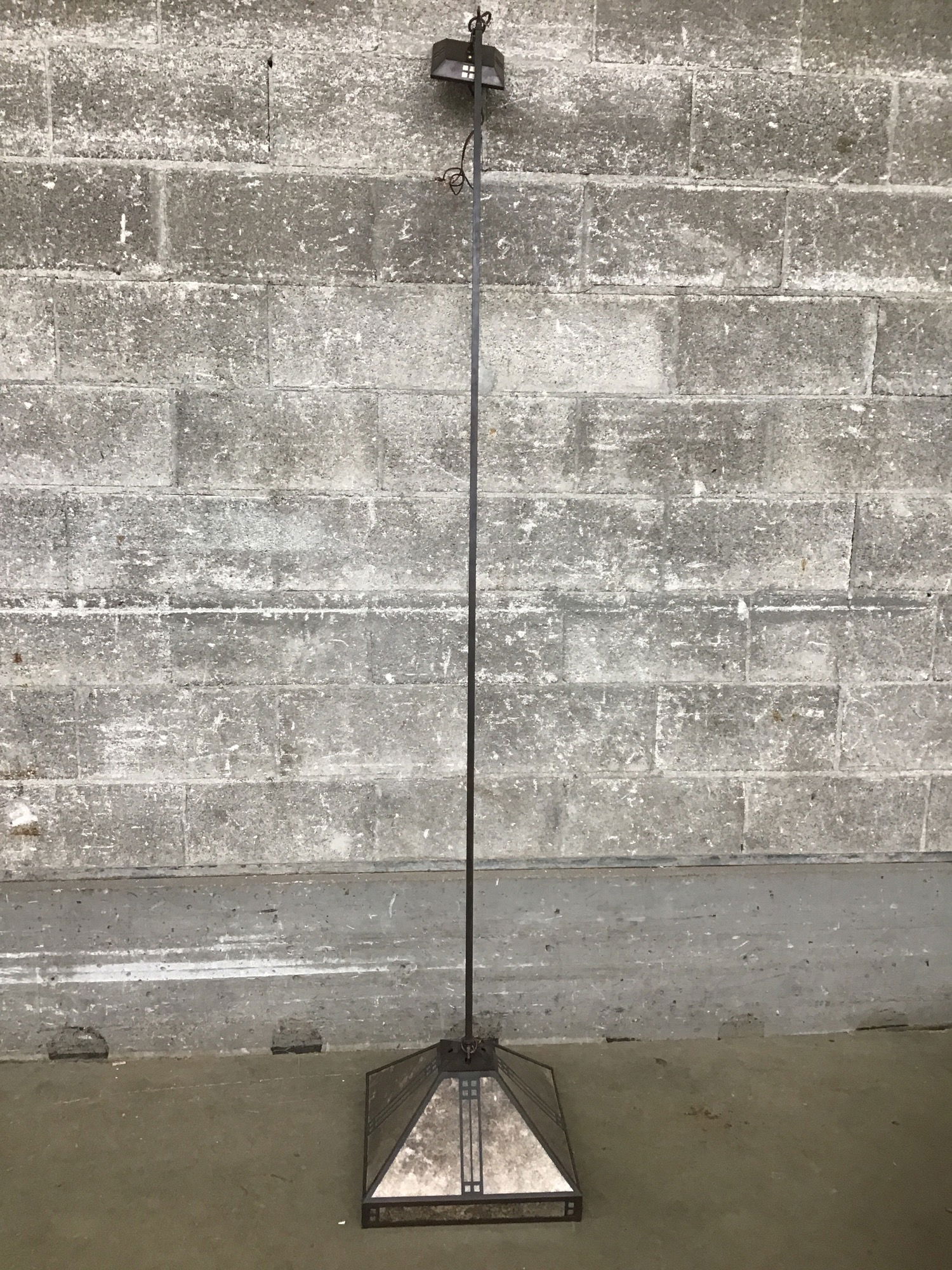 This is a pendant light with a very long stem that has a Craftsman style shade and the whole light has an oil-rubbed bronze finish.