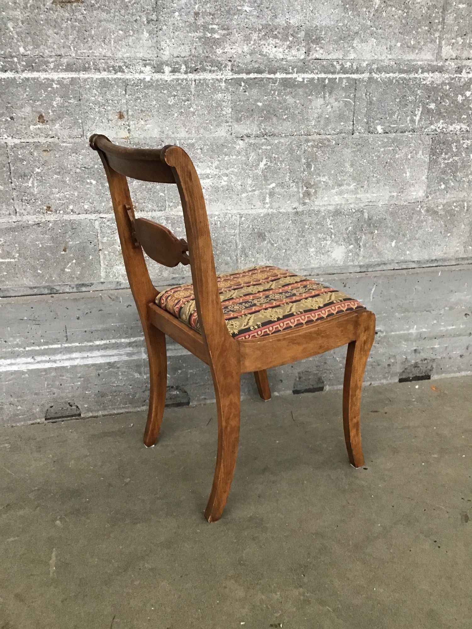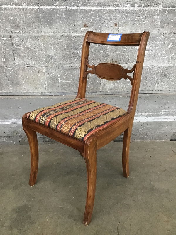 This is a cute dining chair in the Federalist style with a small back splat with figured walnut. The pattern on the upholstery is quite busy but par for the course for the style.