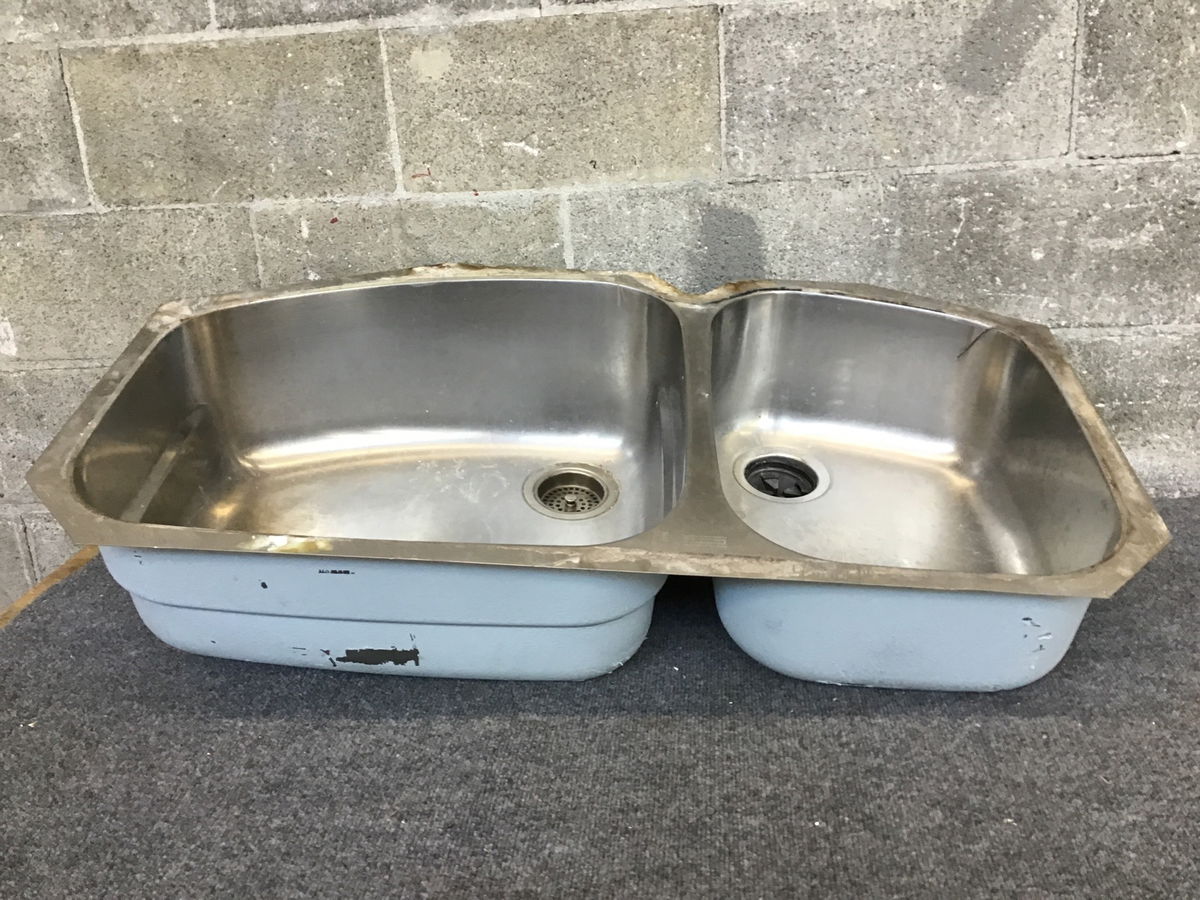 Franke undermount stainless steel kitchen sink, shows quite a bit of surface wear--price reflects. The smaller right bowl is ~7 1/2" deep.