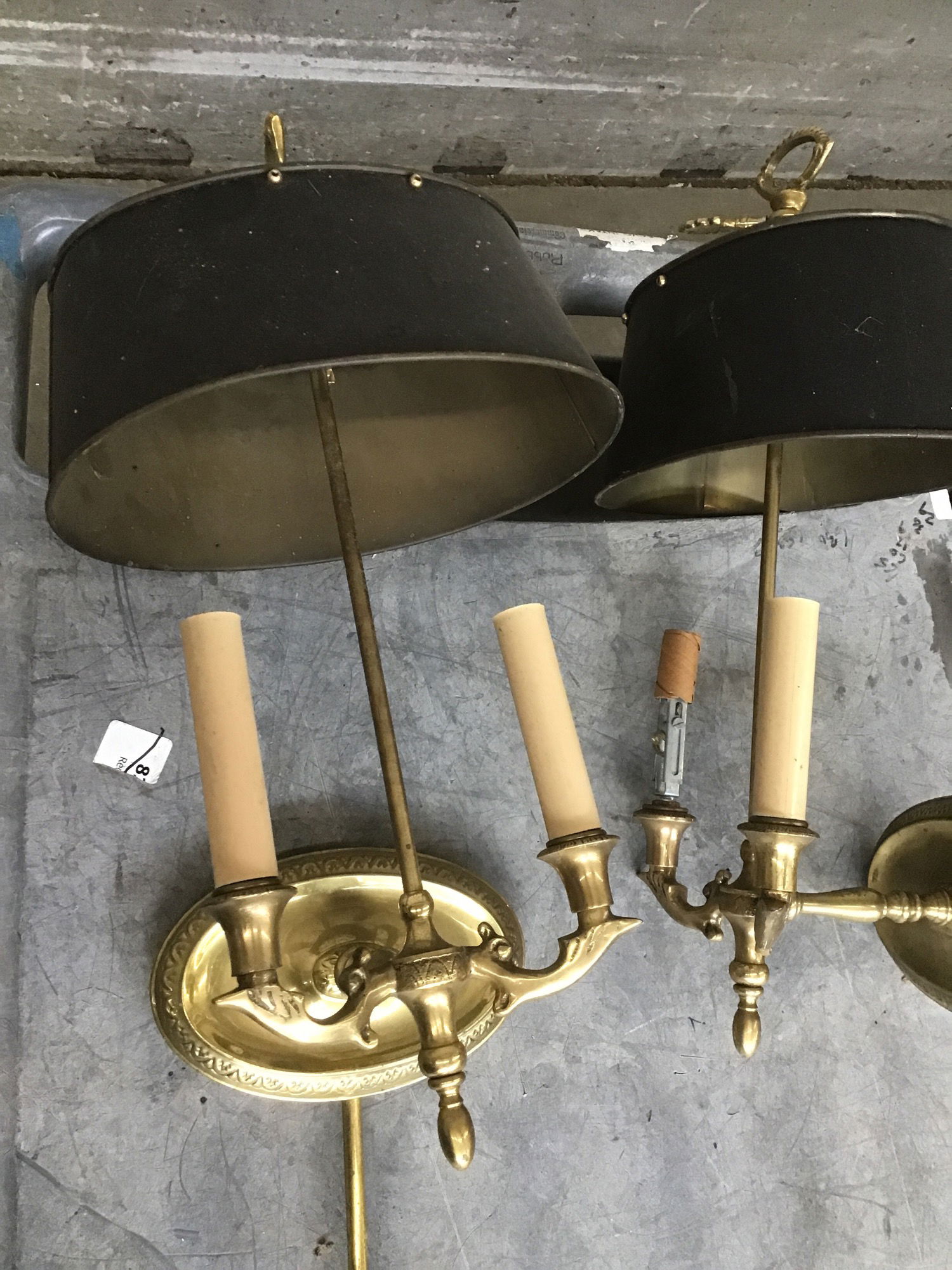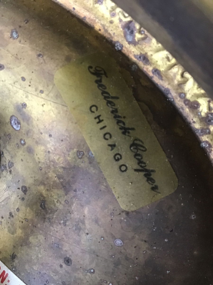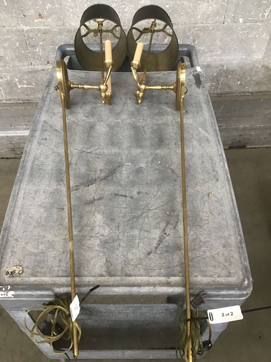 This Frederick Cooper sconce pair, dated from 1991, features steel shades and brass finished body. A quick internet search shows that Frederick Cooper lighting is still going strong; their lights start at several hundred dollars each. This pair looks to be suited for bedside use, with a plug-in all wired up. However this pair has suffered a disintegration of its parts and needs a some attentive repairs to be restored. Price reflects project status, sold as a pair.