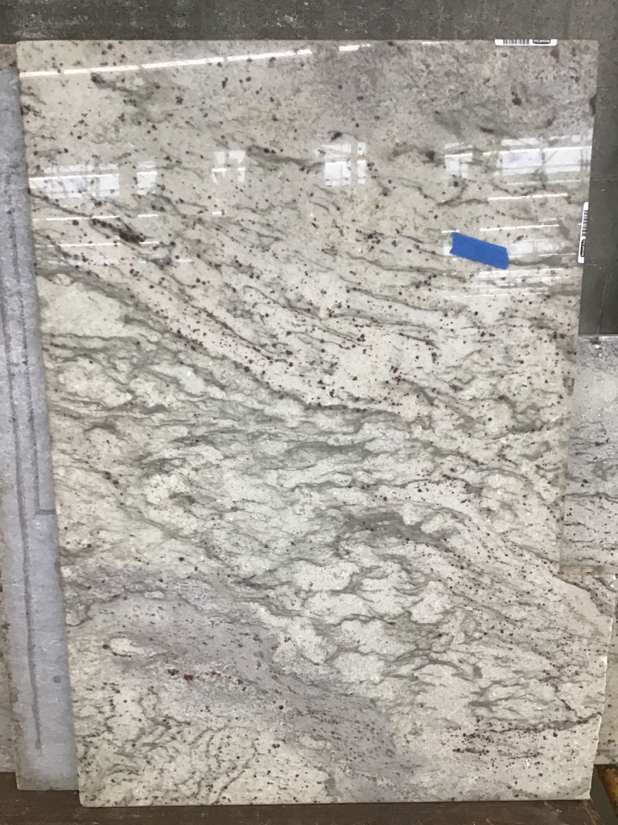 Nice slab of granite with wavy veins of cream and grey, highlighted by pink flecks throughout. Has four finished edges, save for section where it was separated during demo. Seems this was once part of a peninsula or pass-through. Width listed is largest usable section.
