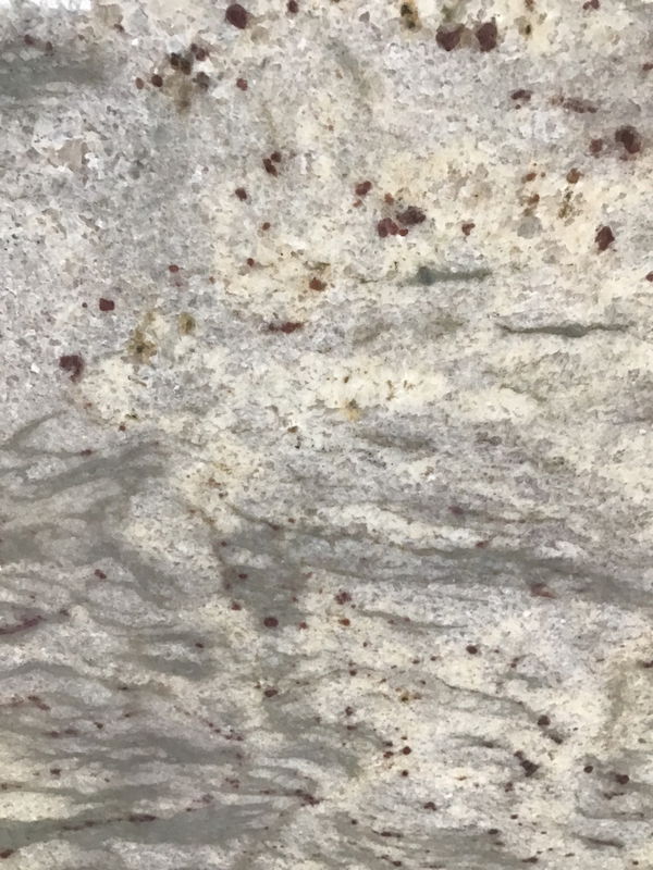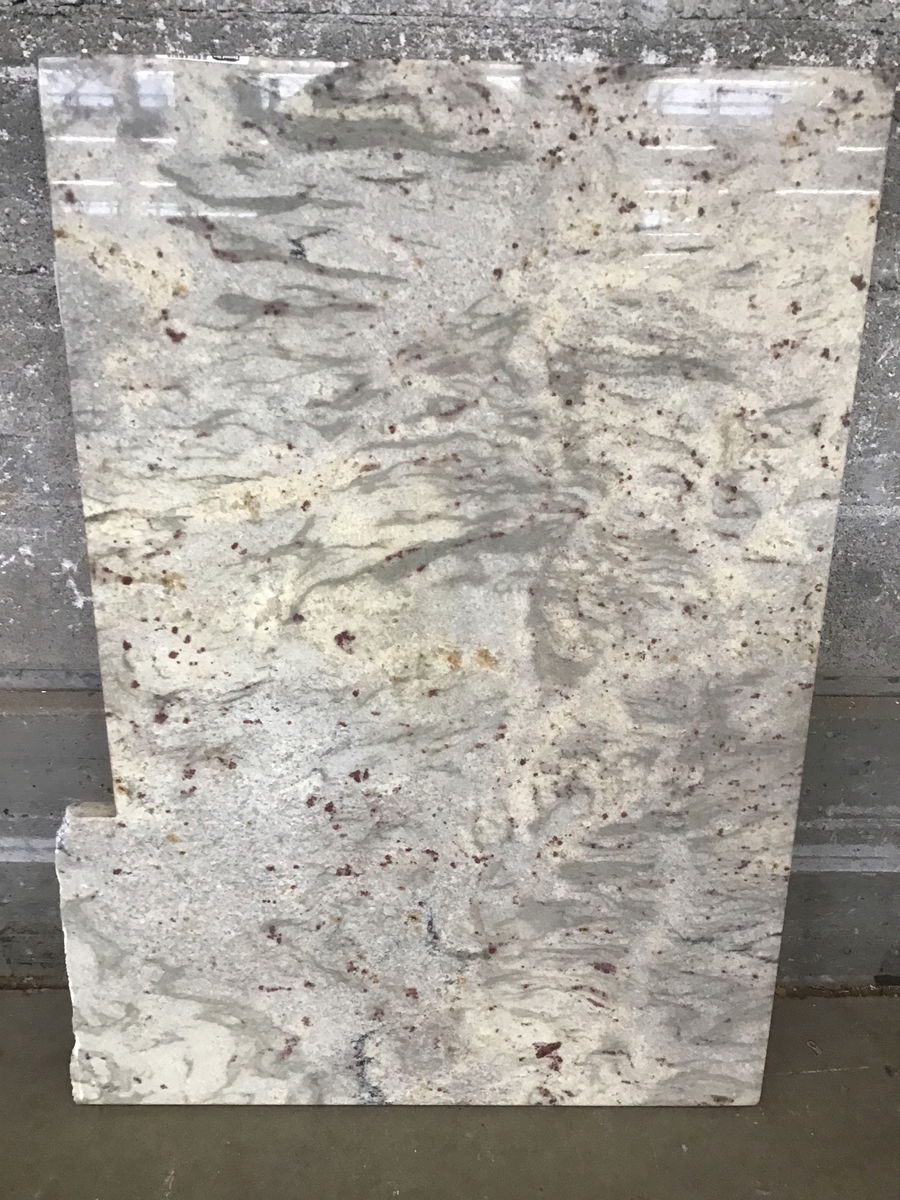 Nice slab of granite with wavy veins of cream and grey, highlighted by pink flecks throughout. Has four finished edges, save for section where it was separated during demo. Seems this was once part of a peninsula or pass-through. Width listed is largest usable section.