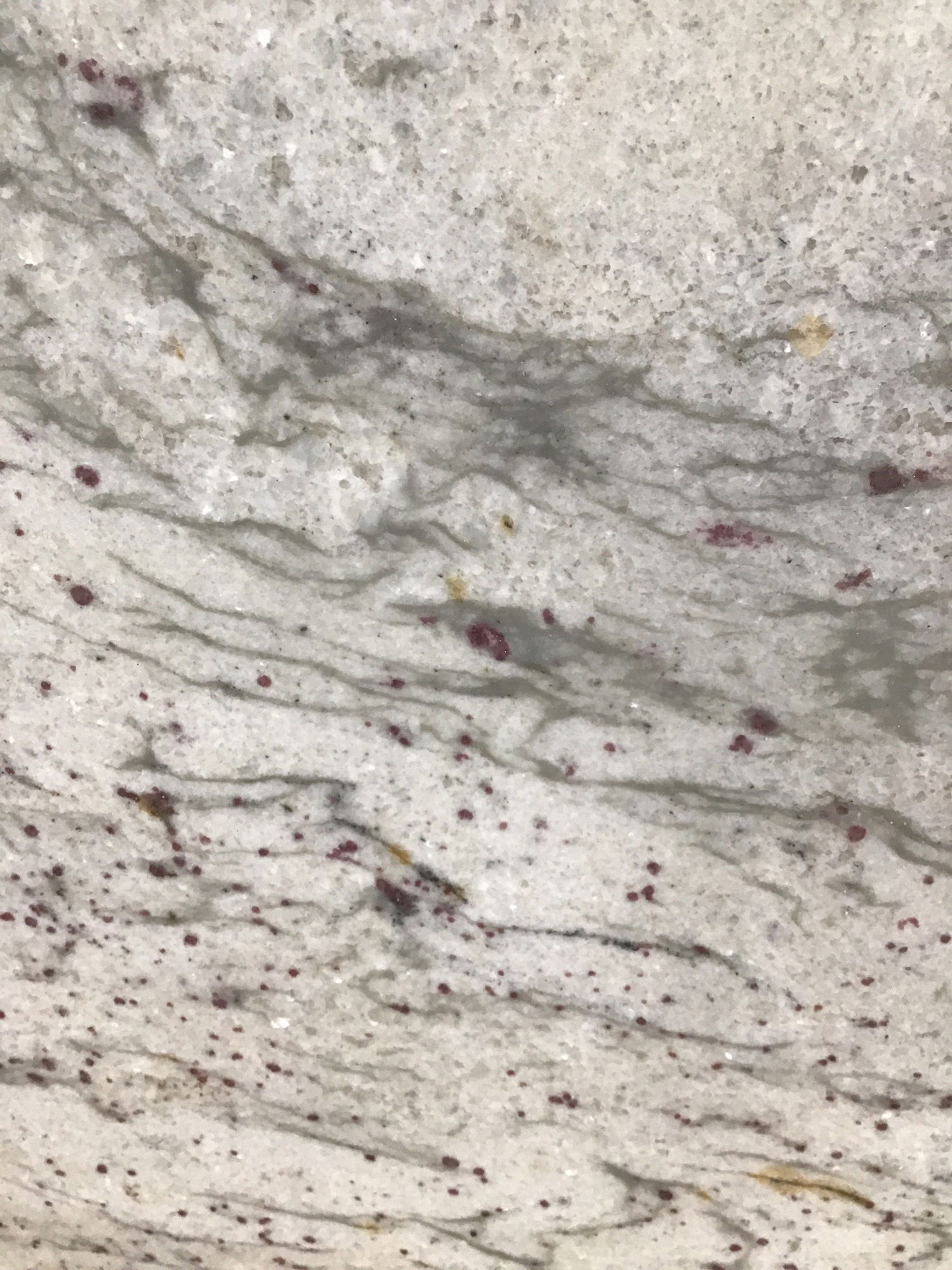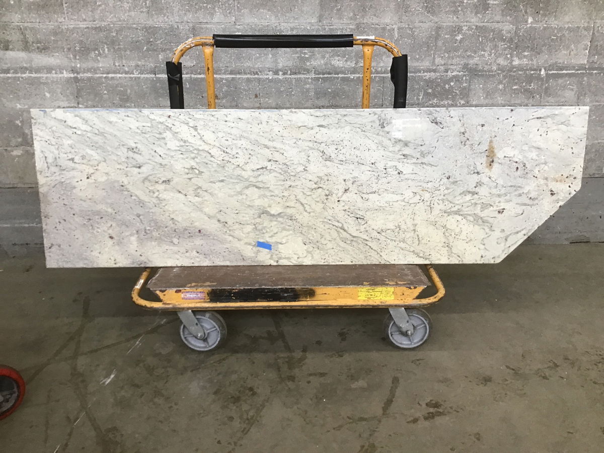 Nice slab of granite with wavy veins of cream and grey, highlighted by pink flecks throughout. Has two finished edges. Length listed is largest usable section.