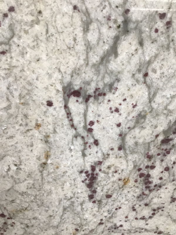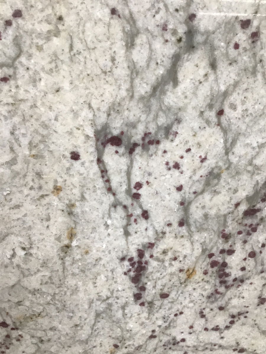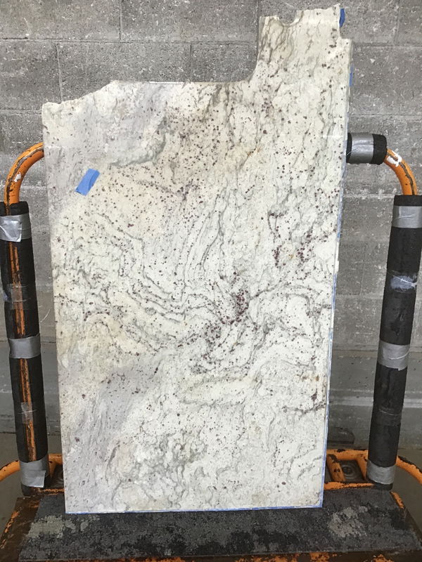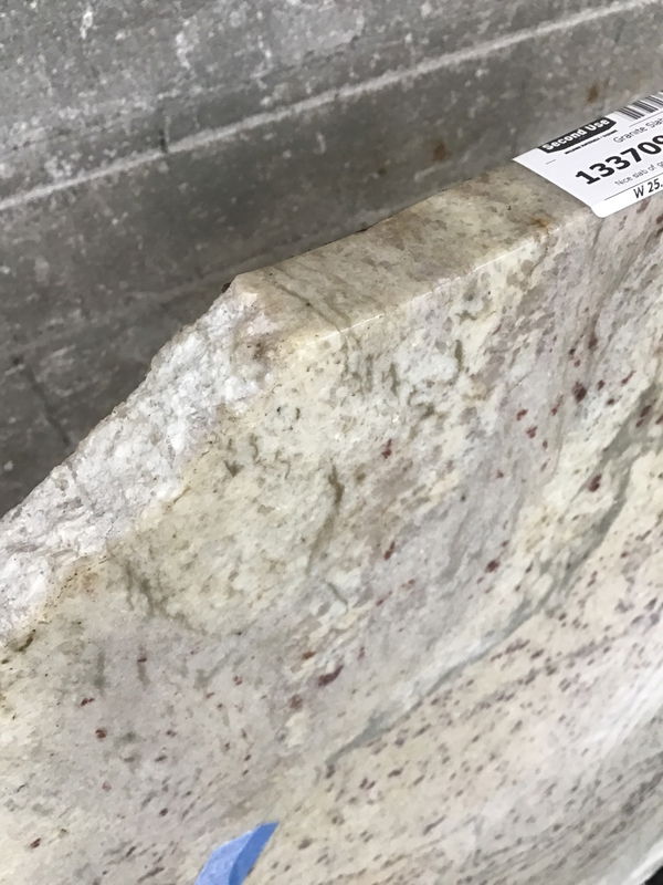 Nice slab of granite with wavy veins of cream and grey, highlighted by pink flecks throughout. Has one finished edge. Note this slab has two metal strips embedded in the underside toward the side that once supported a sink, these are SHARP!! Length listed is largest usable section.