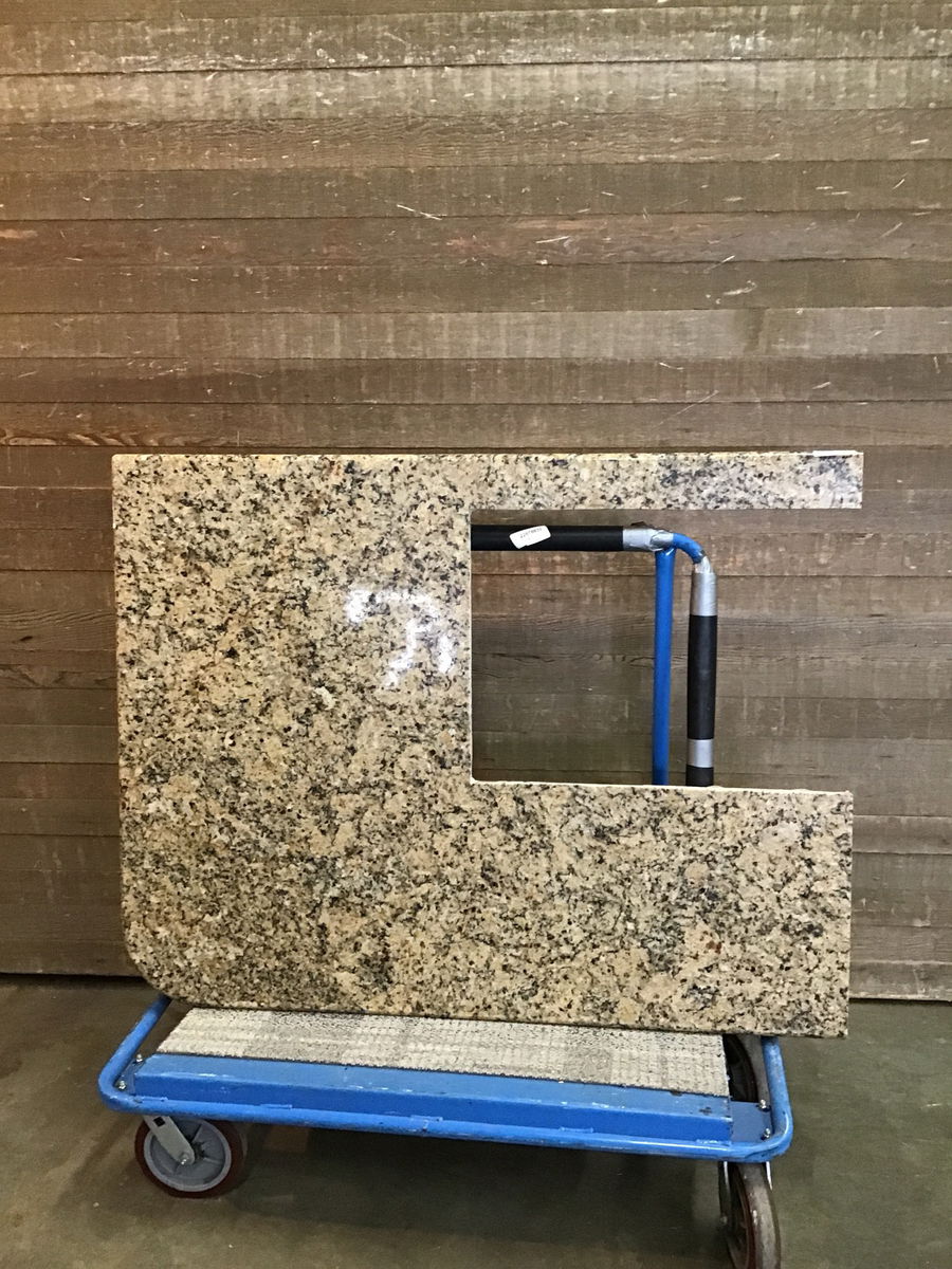 Gold granite slab top with finished edges along one width and two lengths. Measured and priced at the largest possible square after cutting off all the uneven parts.