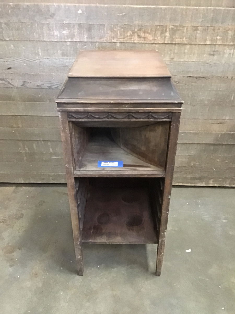 Gutted Pathé Frères hand-crank phonograph. Cabinet as a whole is very sturdy but its gutted out! Should be easy to find parts for it if you intention is to build it back. Could also be made into a cool cabinet.
