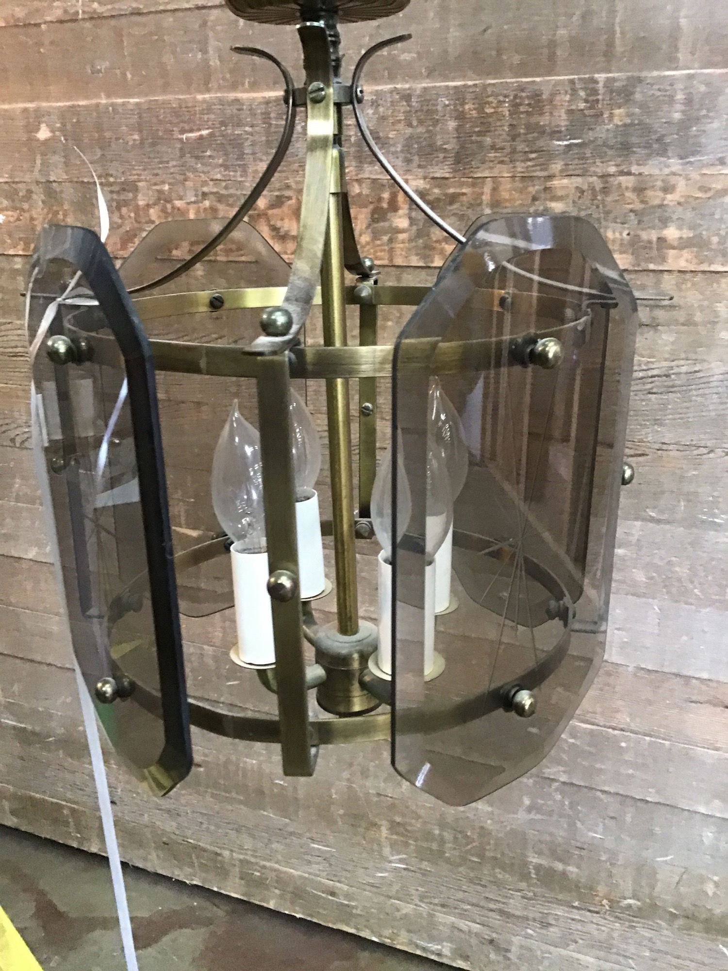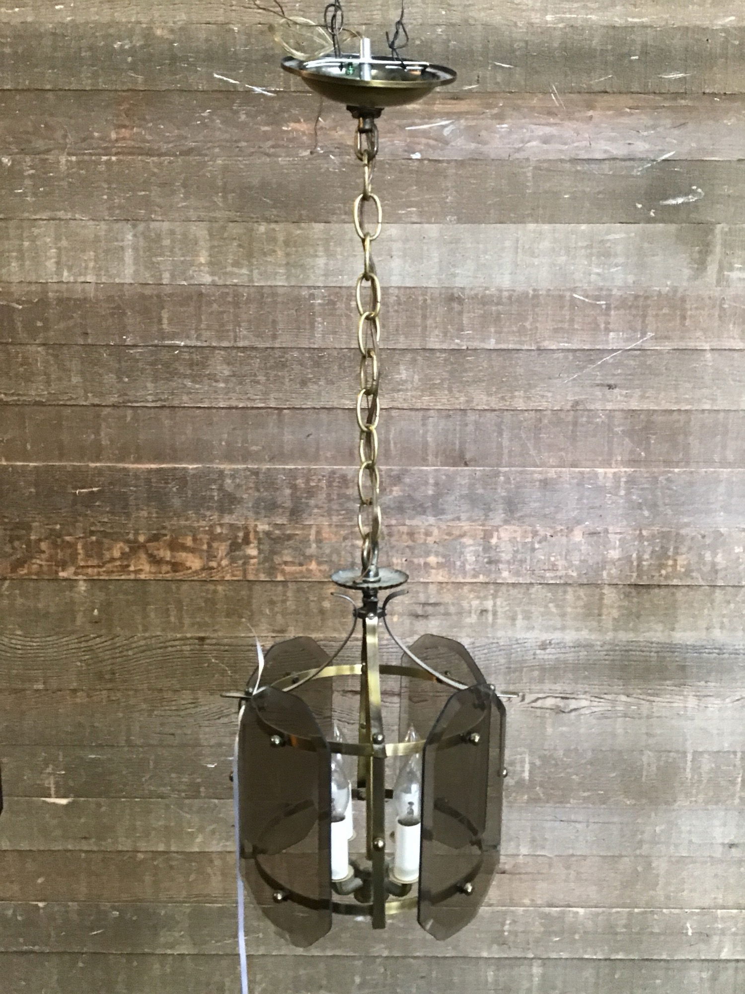 Vintage hanging light in good, used condition. Features four small chandelier style bulbs and four etched, smokey glass panes. The body has a antiqued brass finish. Measurement does not include about 13" of chain. Wiring looks great, though we always recommend a full test prior to installation.