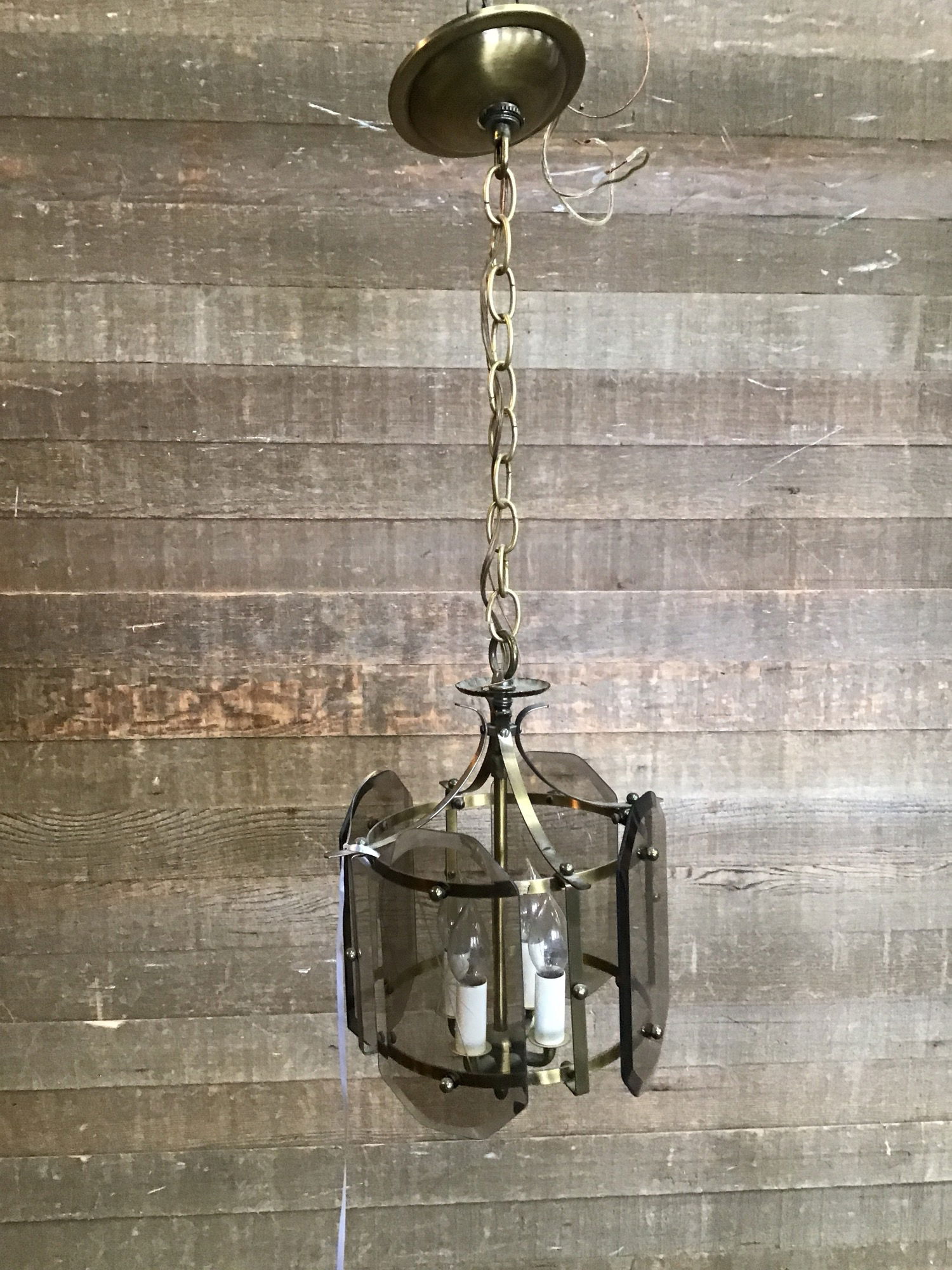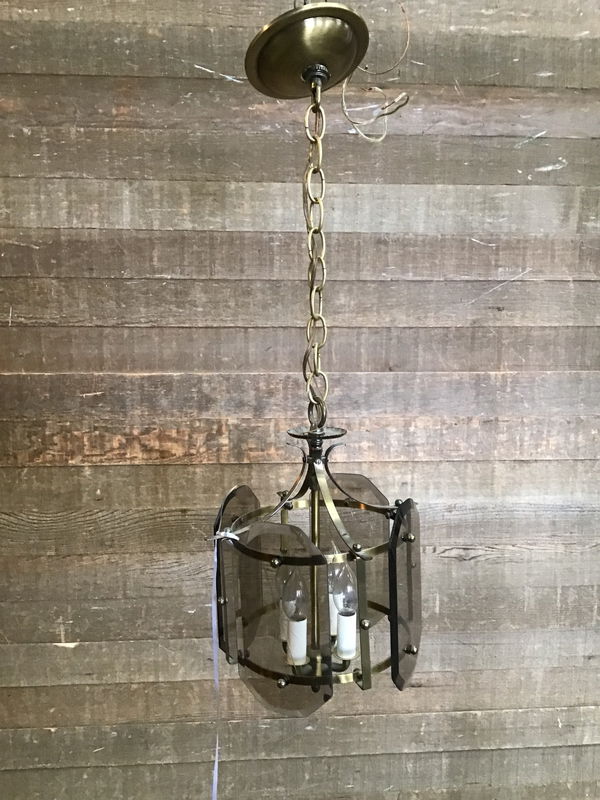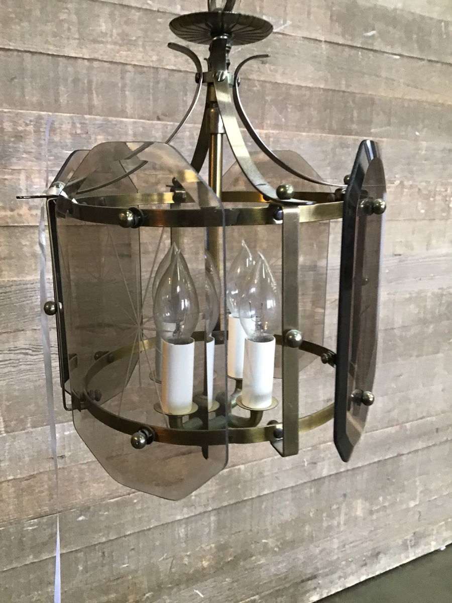 Vintage hanging light in good, used condition. Features four small chandelier style bulbs and four etched, smokey glass panes. The body has a antiqued brass finish. Measurement does not include about 13" of chain. Wiring looks great, though we always recommend a full test prior to installation.