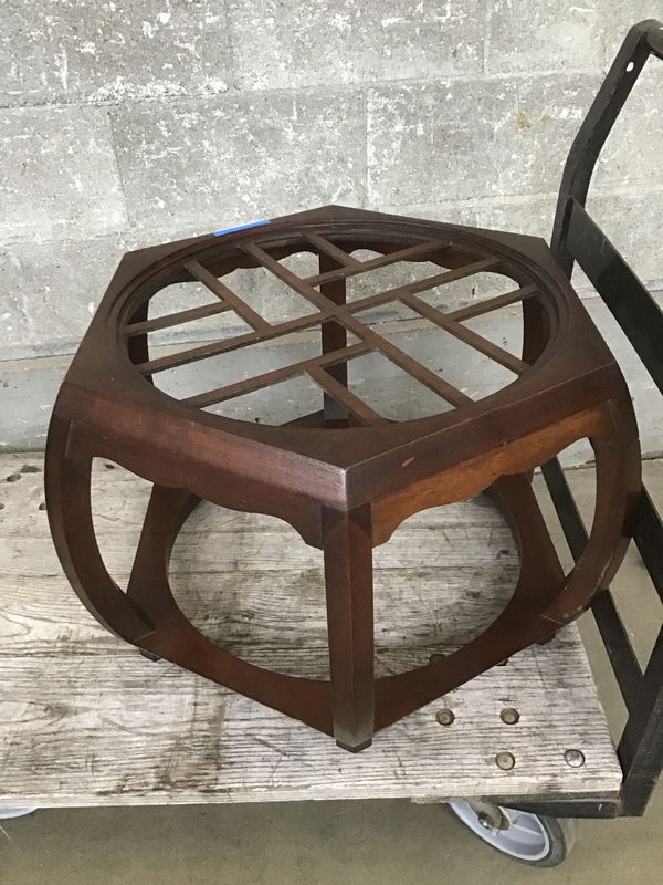 A very pristine Hekmn Chippendale style hexagon end table. It once had a glass top, but could easily be replaced (19.75"x19.75"). The piece features a mahogany frame with swooping and crossing design flairs that celebrate Asian design sensibilities. This would be perfect in your living room!