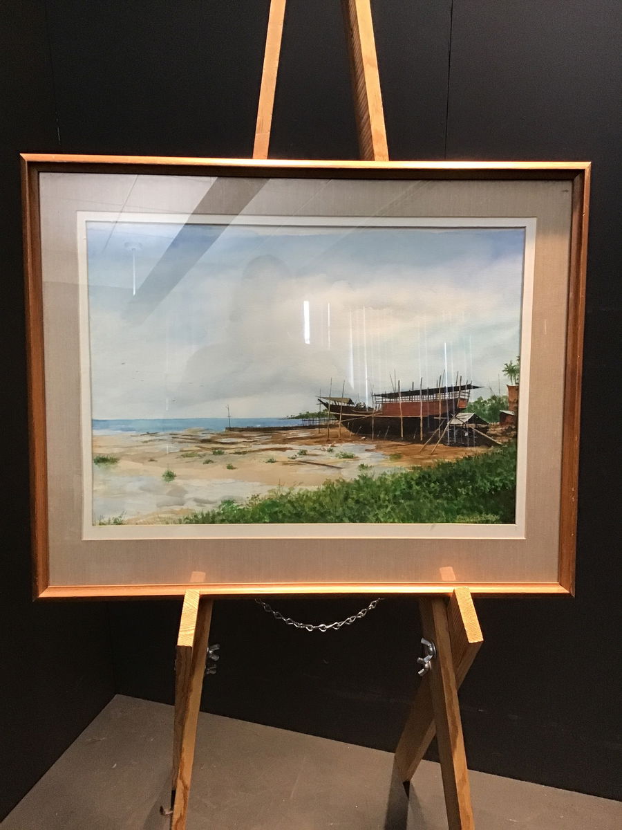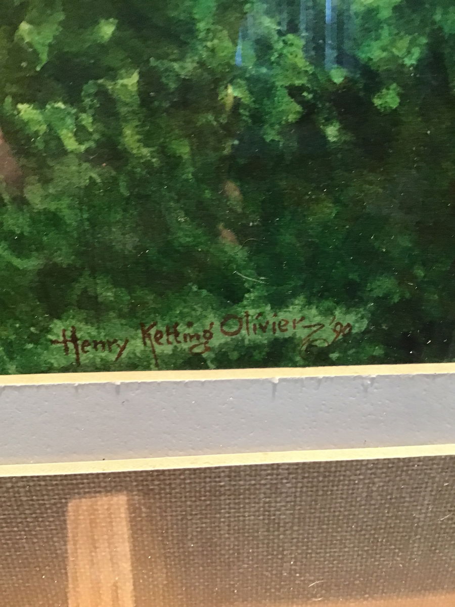 Henry Ketting Olivier was an artist known for his landscapes with ties around the world, he was born in Indonesia, studied in the Netherlands and the United States. He was a renowned art teacher for years after emigrating to the US after WWII. This is an original of his, depicting a beach scene from his native Indonesia in a beautiful wood frame with fabric border surrounding the piece. A great piece from a wonderful artist who was present in the California art scene for a great deal of his life.