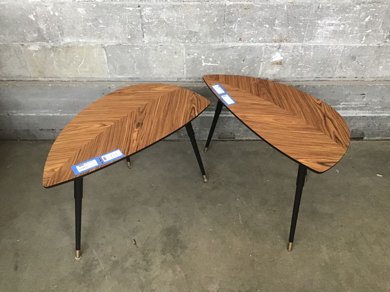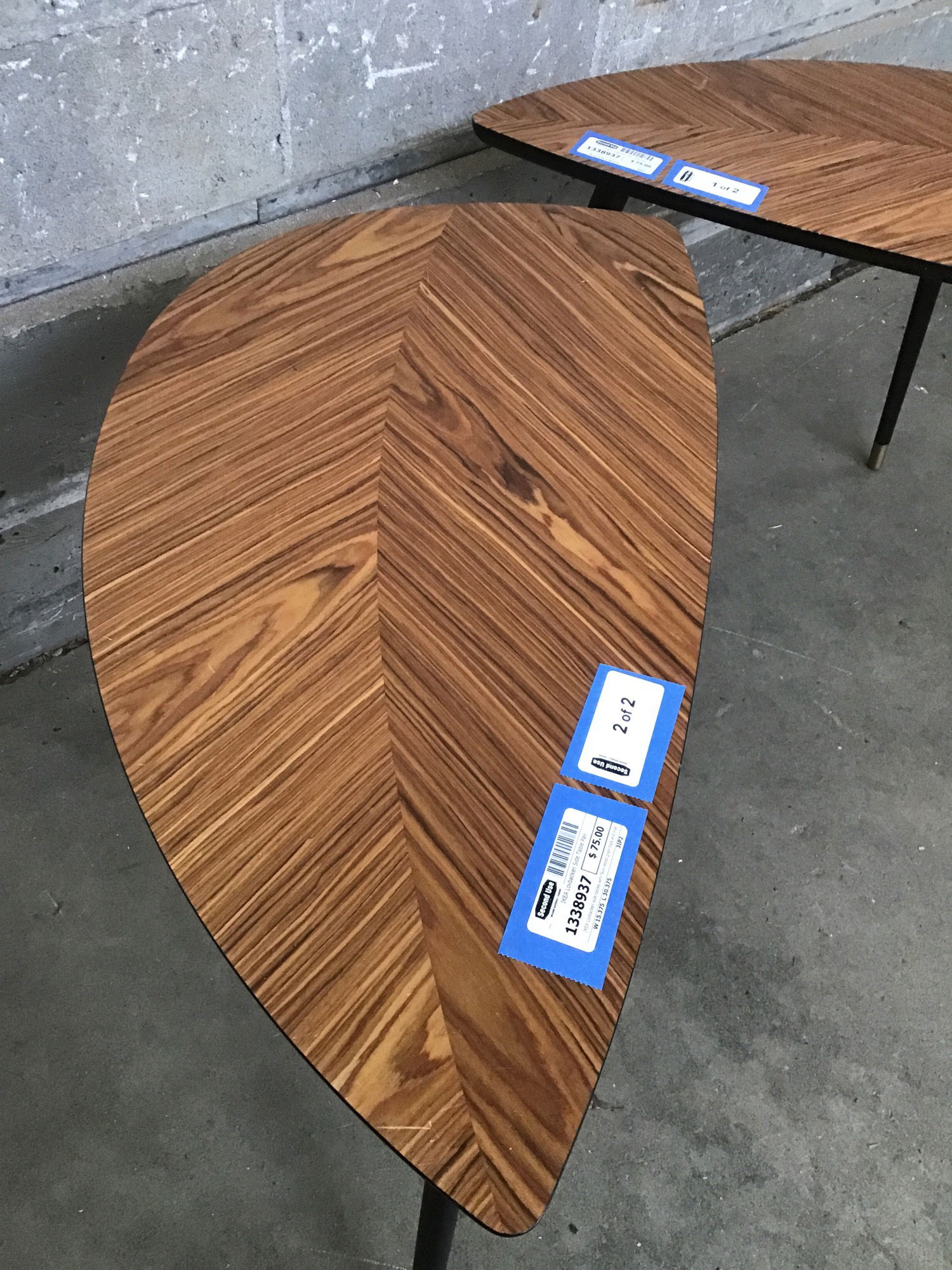 IKEA Lovbacken side tables with faux wood grain tops and matte black legs. Due to the shape of the tops and the way the grain is split down the center, they are very reminiscent of leaves! Their shape and size make them very functional and convenient for alongside a couch or comfy chair. Made in 2019 and in very good shape. See a single table retailing here for $99!