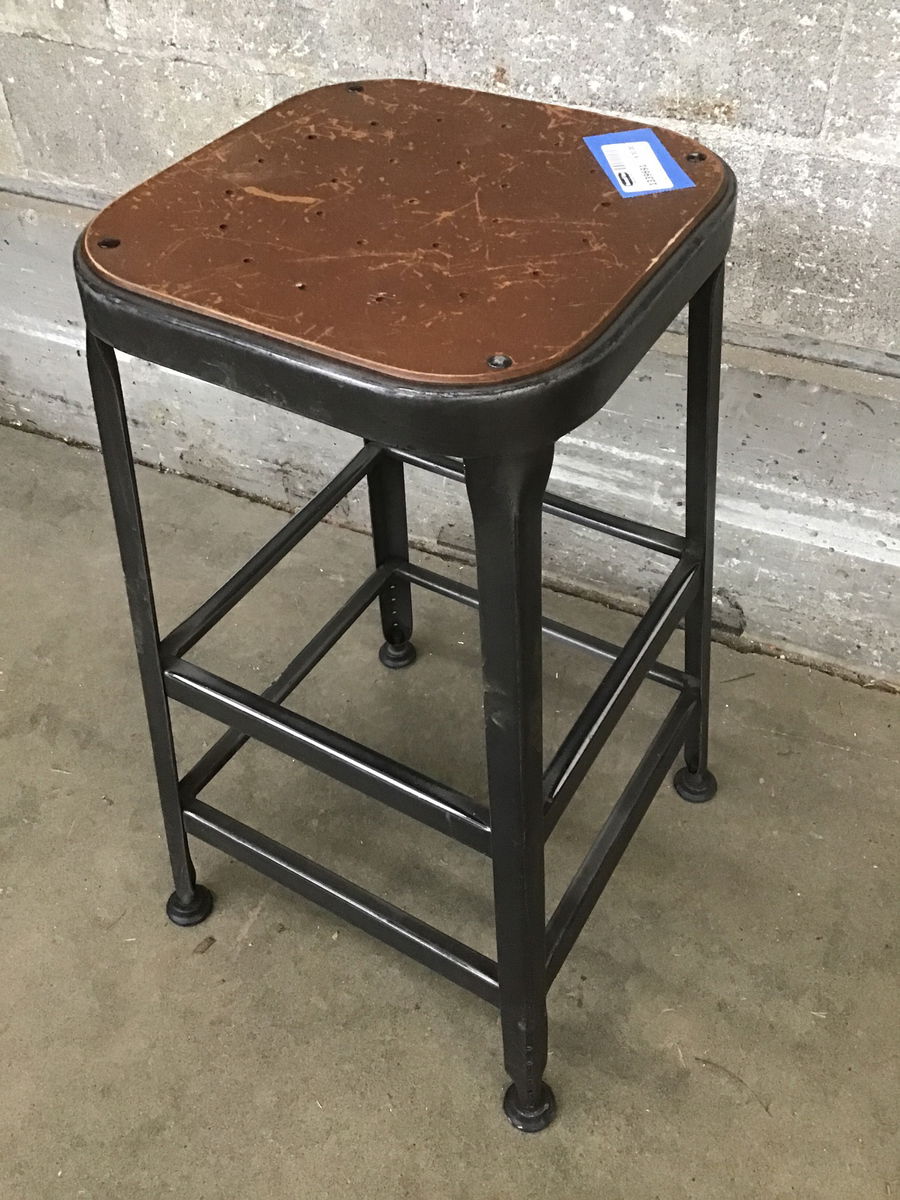 A steel stool with an industrial vibe to it and a pressboard seat that's had a bit of exposure to water, though it's still usable. You might even find something to do a little project for yourself.... Photos may be representative.