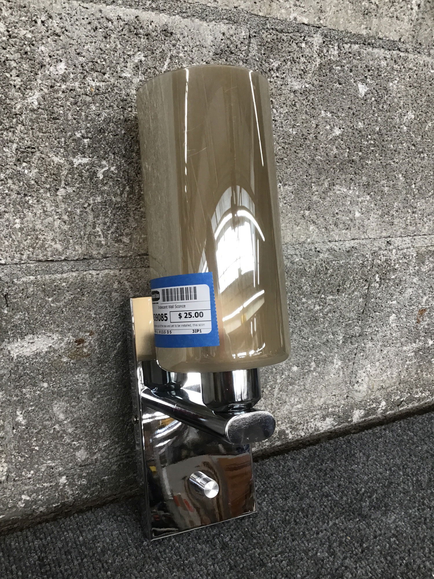 Just taken out of the box and yet to be installed, this sconce has a polished chrome fitter and an iridescent, kind of smoky cylindrical shade. Features a turn switch on the backplate to turn it on and off.