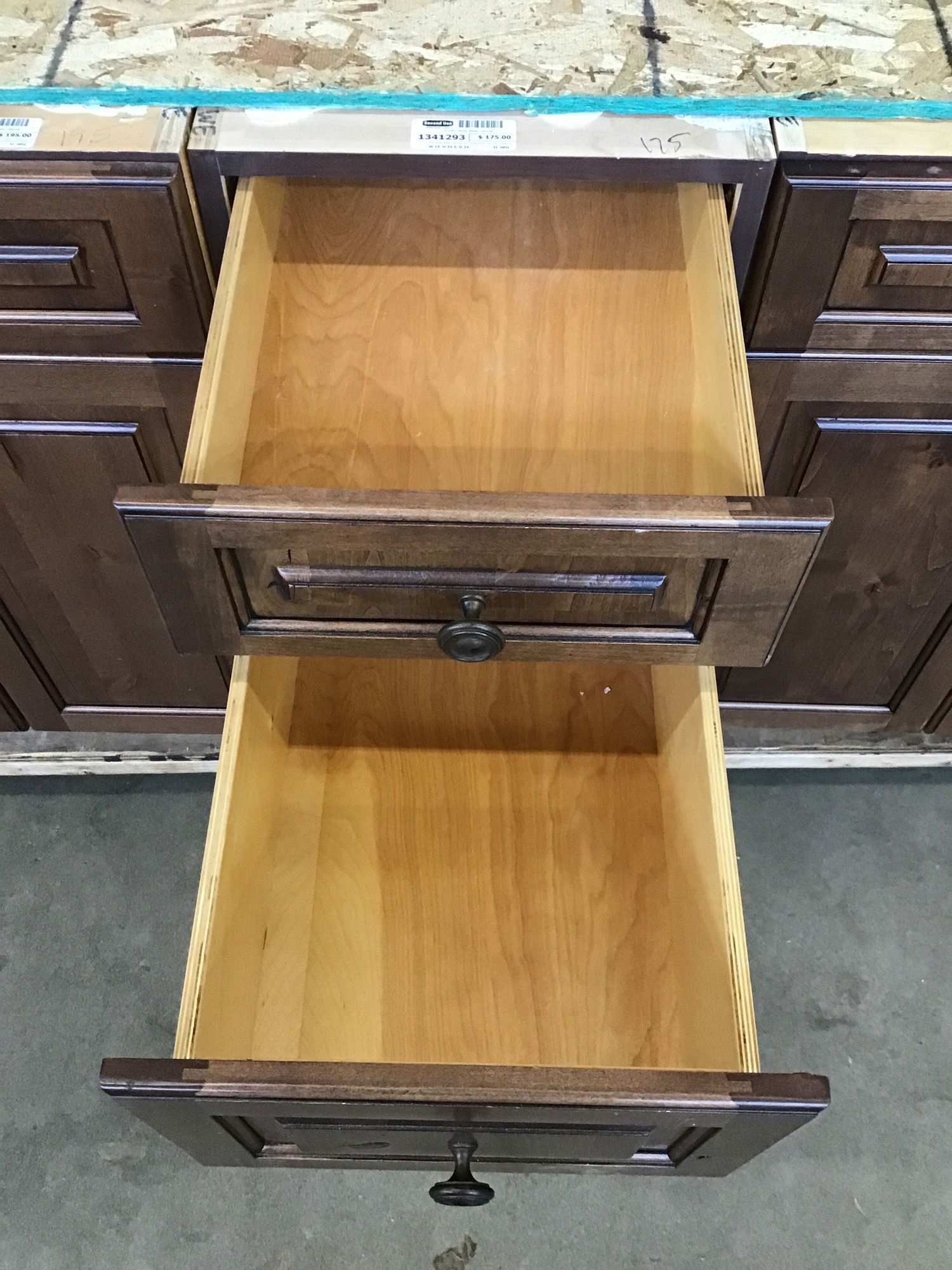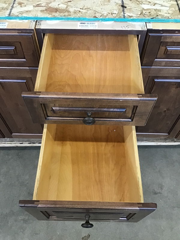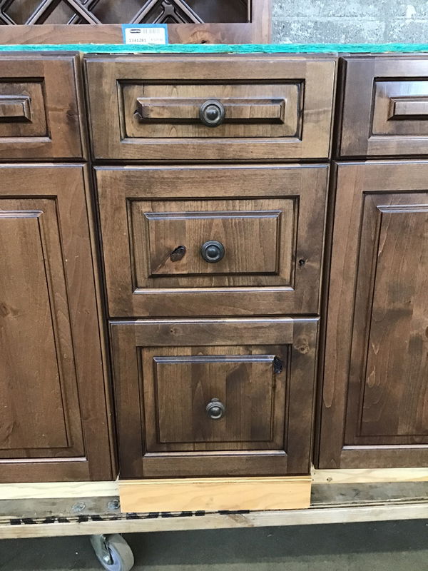 Knotty Alder Base Cabinet with a dark stain and oil-rubbed bronze hardware.
