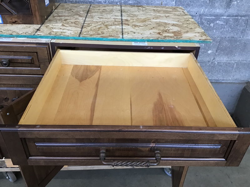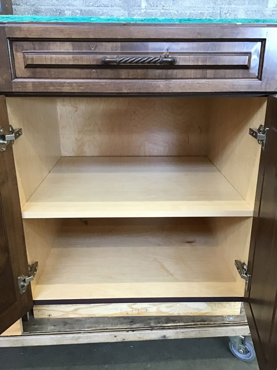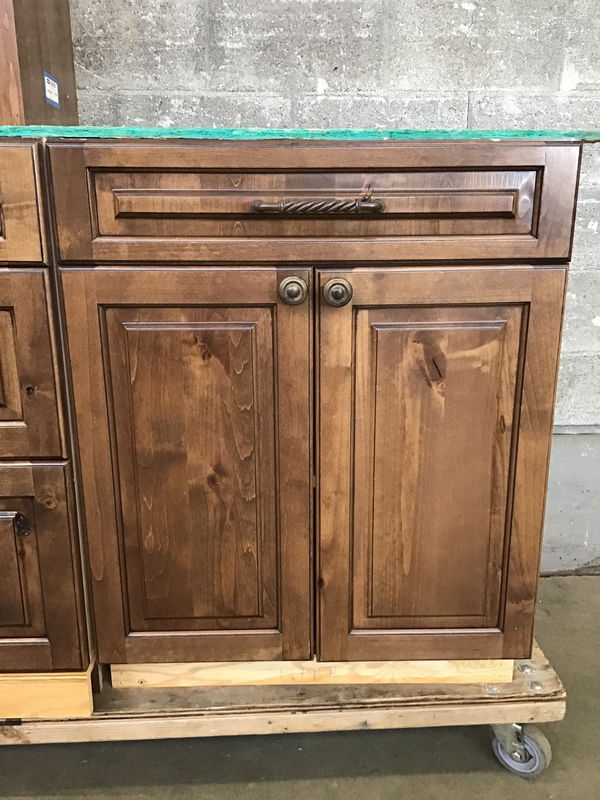Knotty Alder Base Cabinet with a dark stain and oil-rubbed bronze hardware. Has two adjustable shelves.