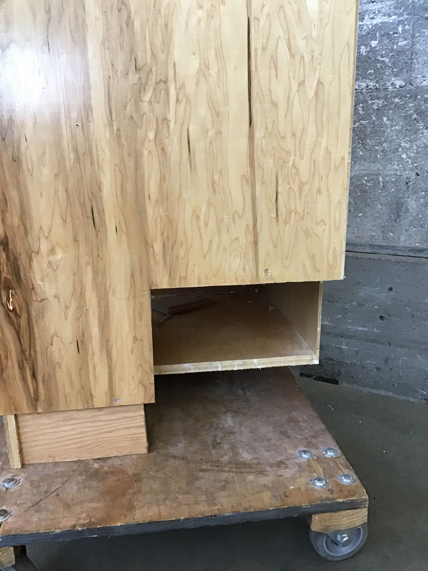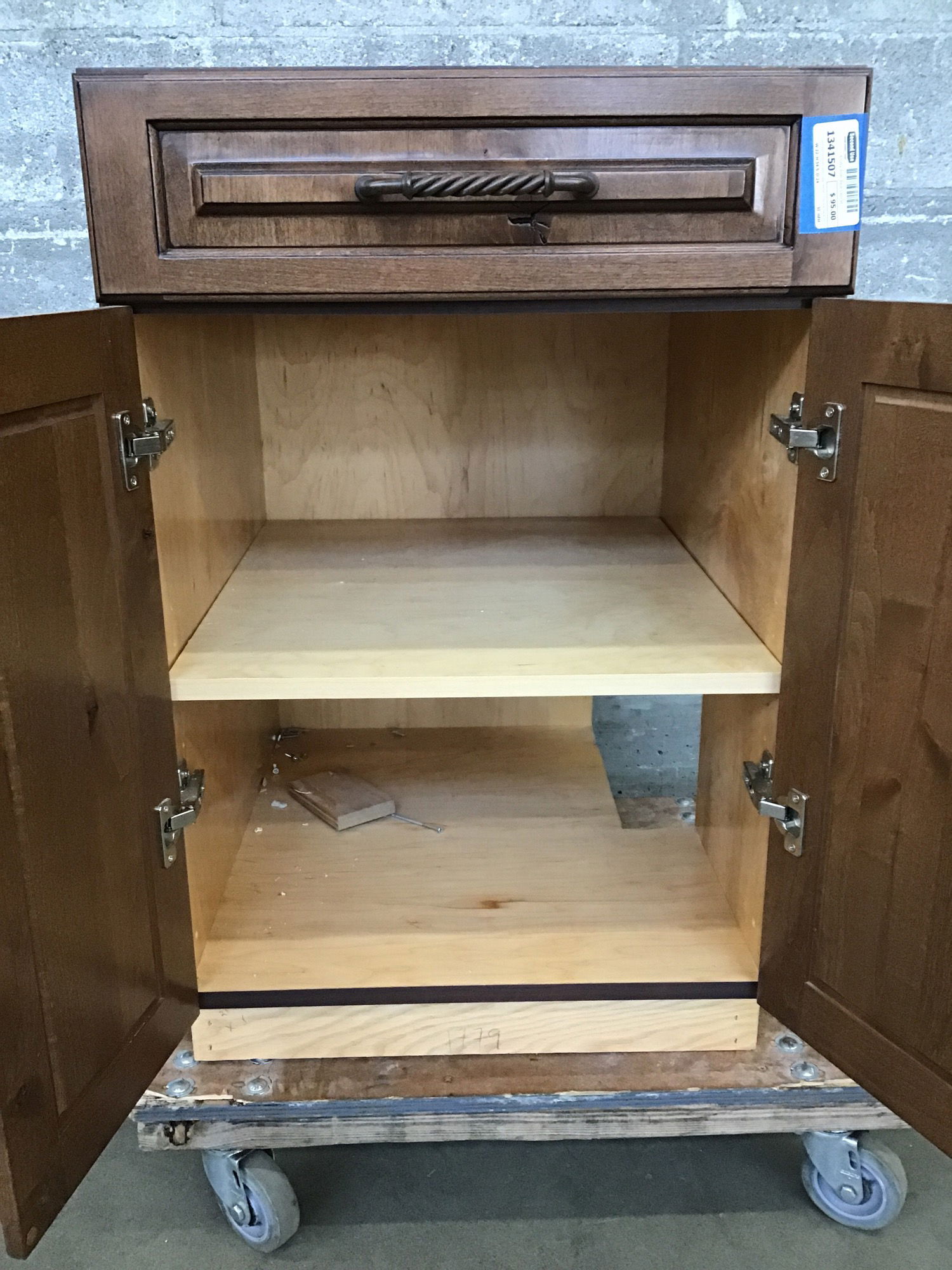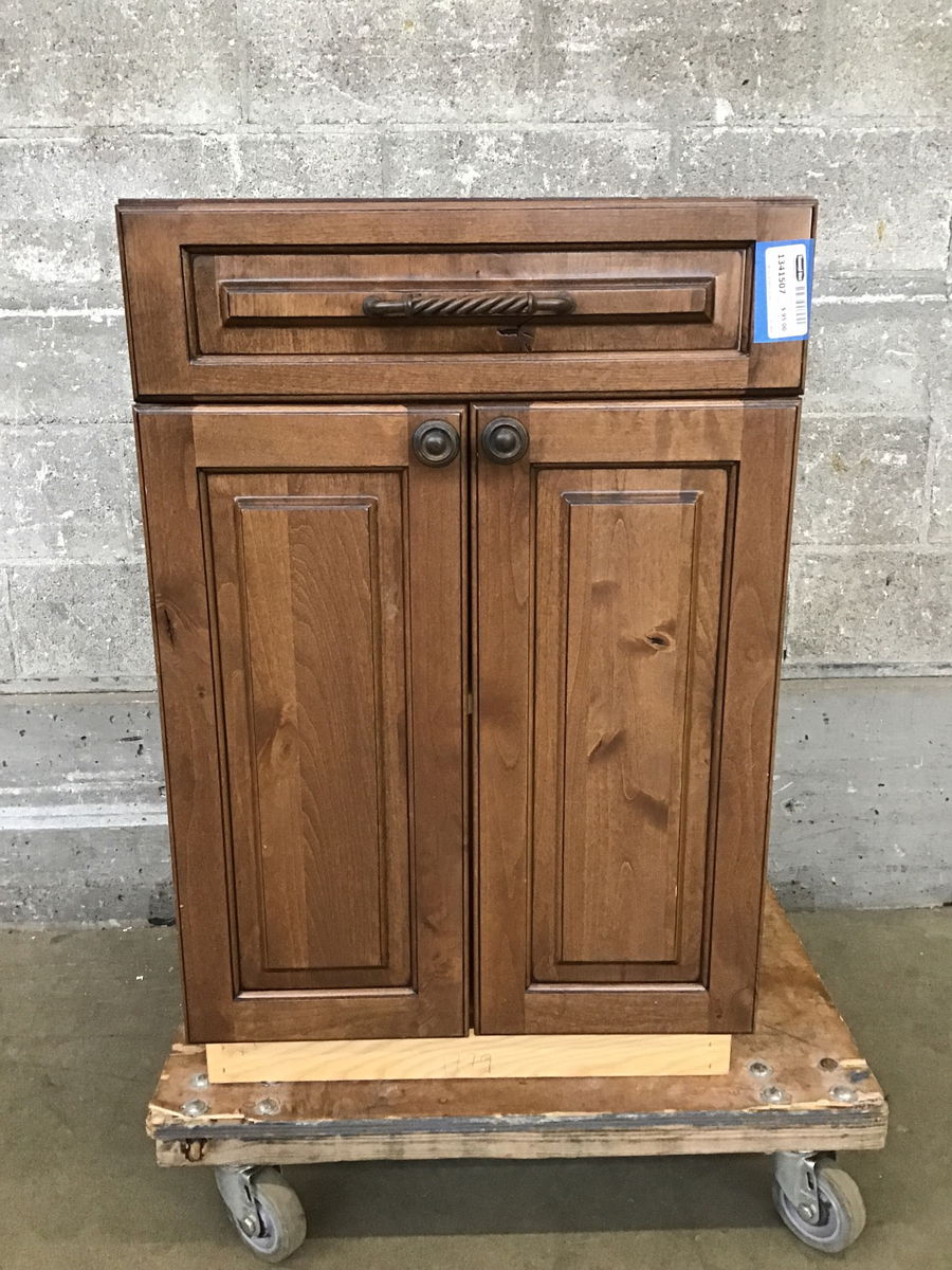 Dark stained knotty alder base cabinet. This one has a notch cut out of the back right corner of the cabinet box. Price reflects.