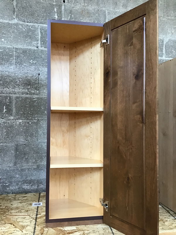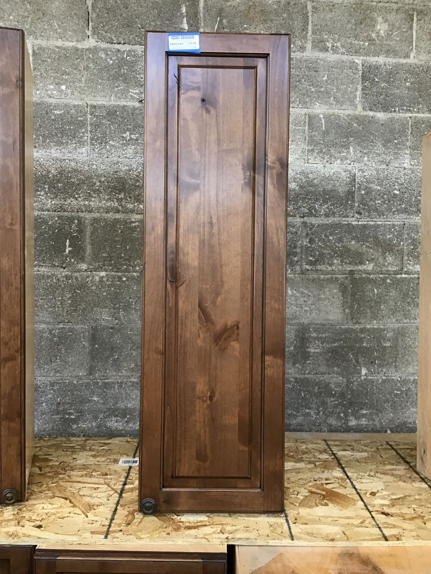 Dark stained knotty alder wall cabinet. This one has an angled back right corner of the cabinet box, which is reflected in the price.