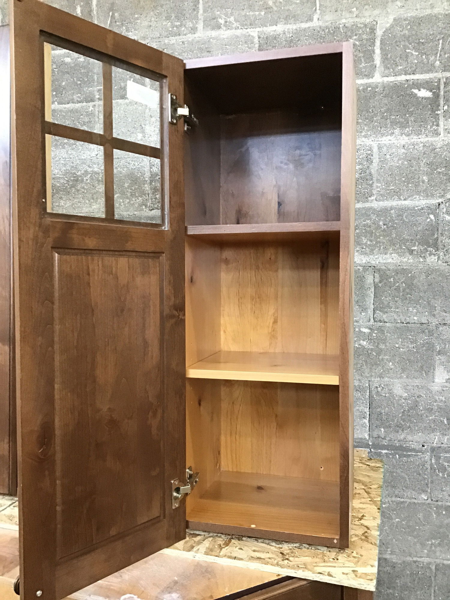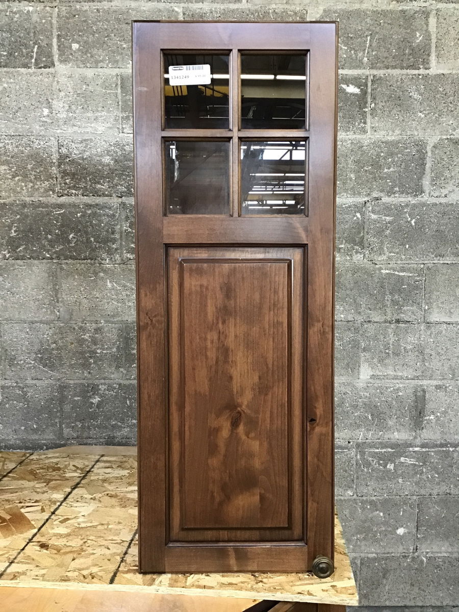 Dark stained knotty alder wall cabinet. This one has some glass up at the top of the cabinet door.