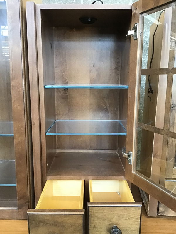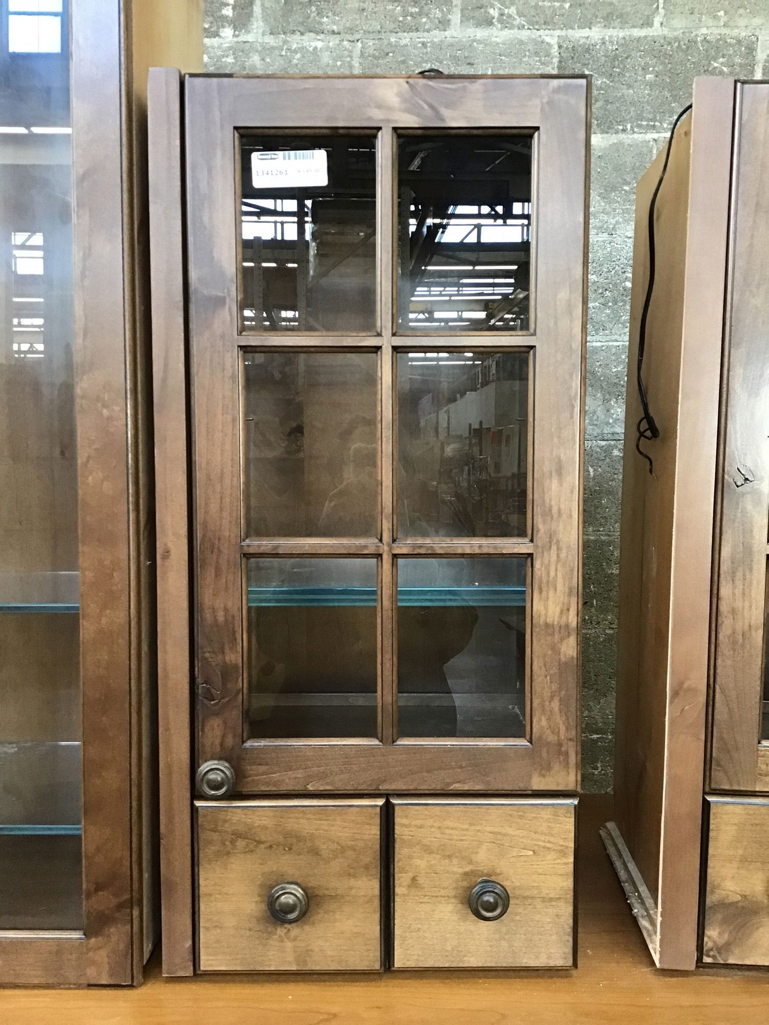 Dark stained knotty alder wall cabinet. This one has a glass door above two spice drawers and glass shelves