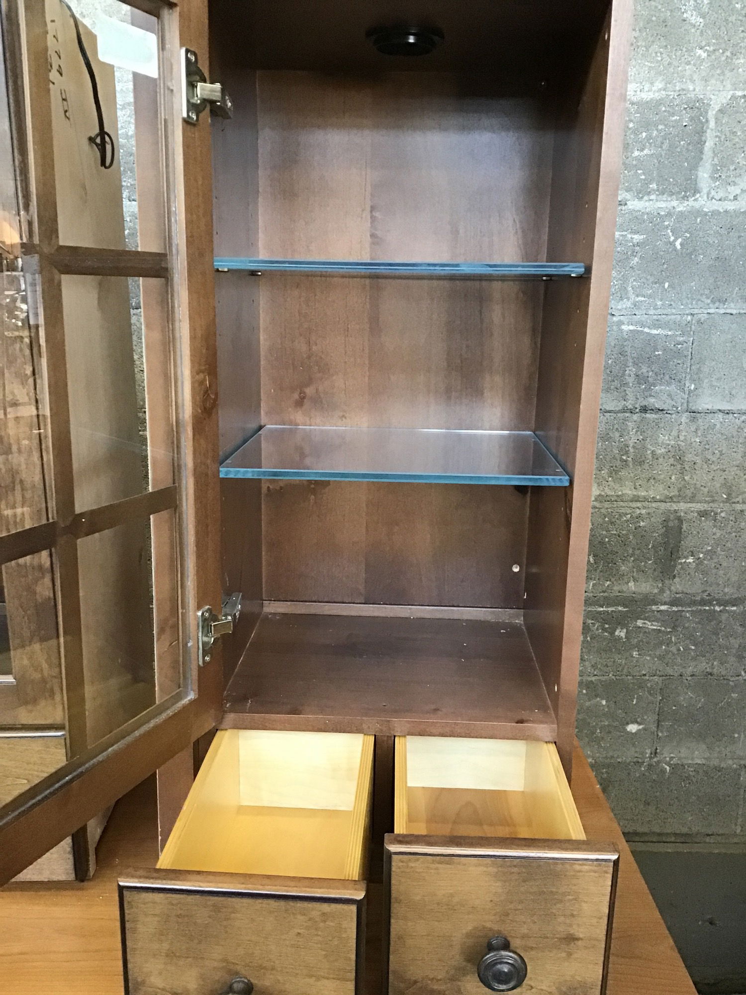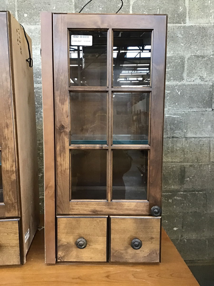 Dark stained knotty alder wall cabinet. This one has a glass door above two spice drawers and glass shelves