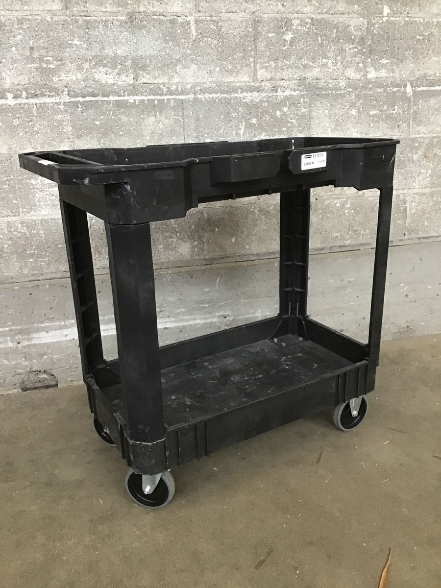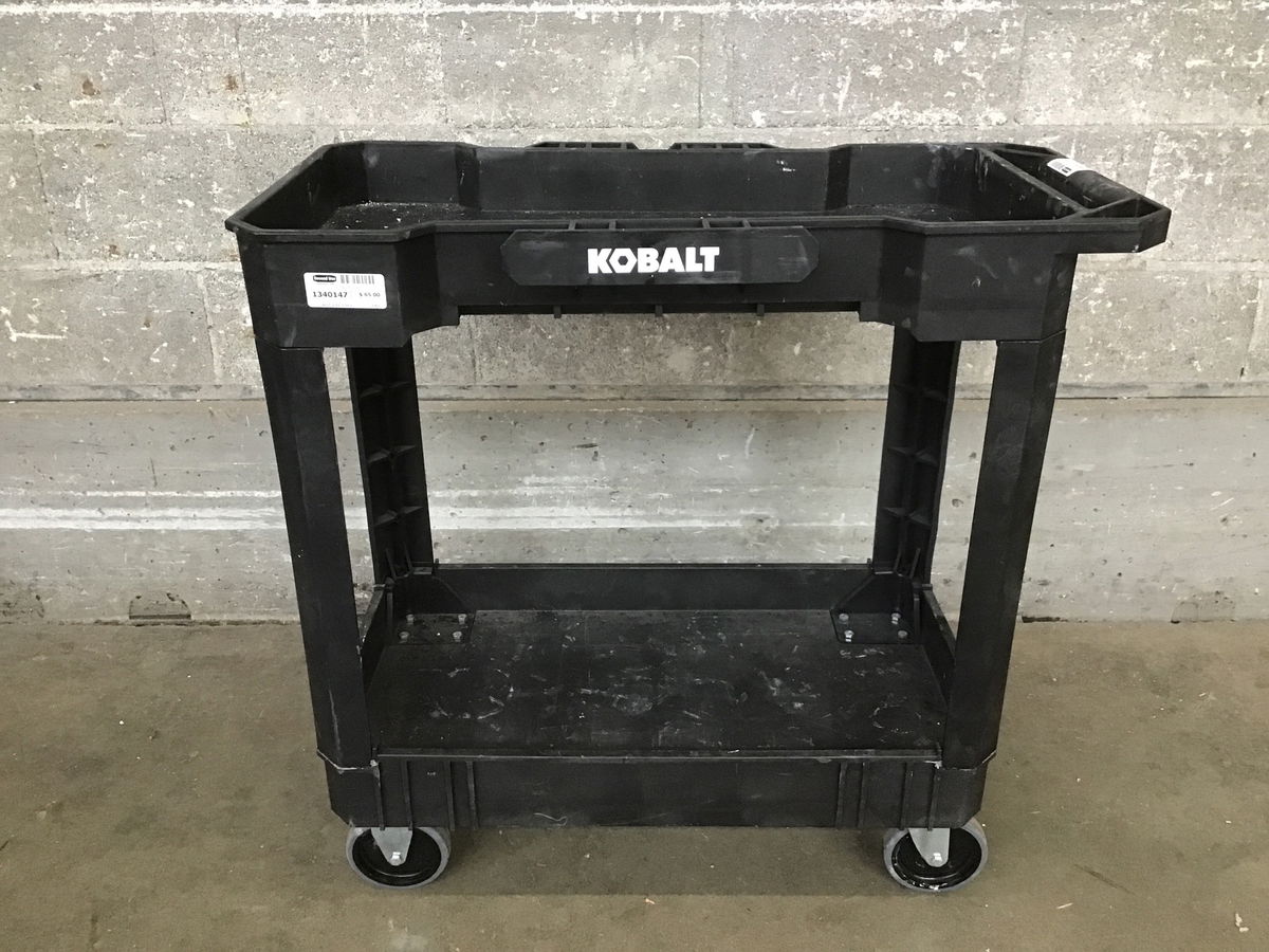 Black plastic utility cart from Kobalt. Has 2 shelves and plenty of doohickeys for organizing all your handy junk! According to the listing it has a 500lb capacity. See it retailing at Lowe's for $140.