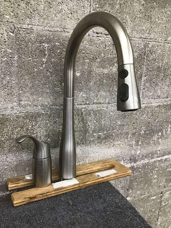 Kohler brushed nickel kitchen faucet with pull-down spray.