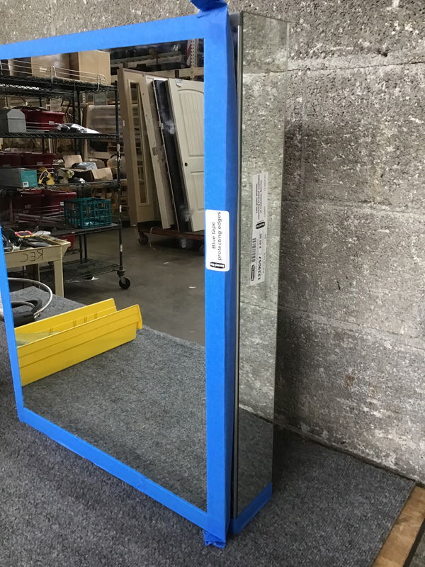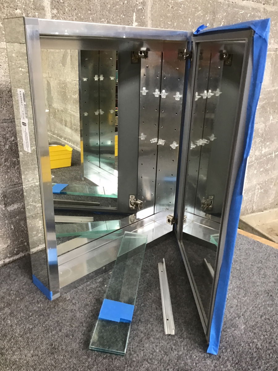 Kohler mirrored medicine cabinet with two glass shelves and mounting bracket.