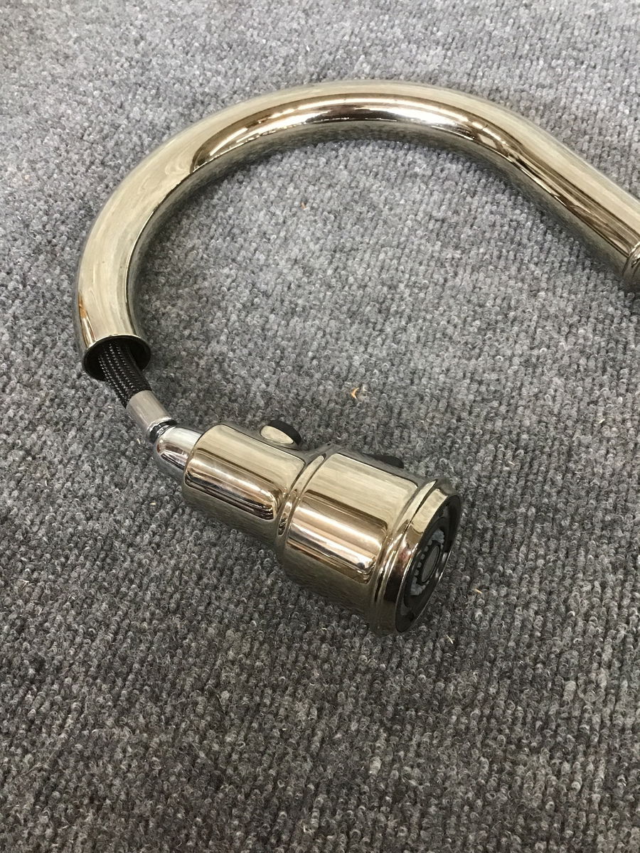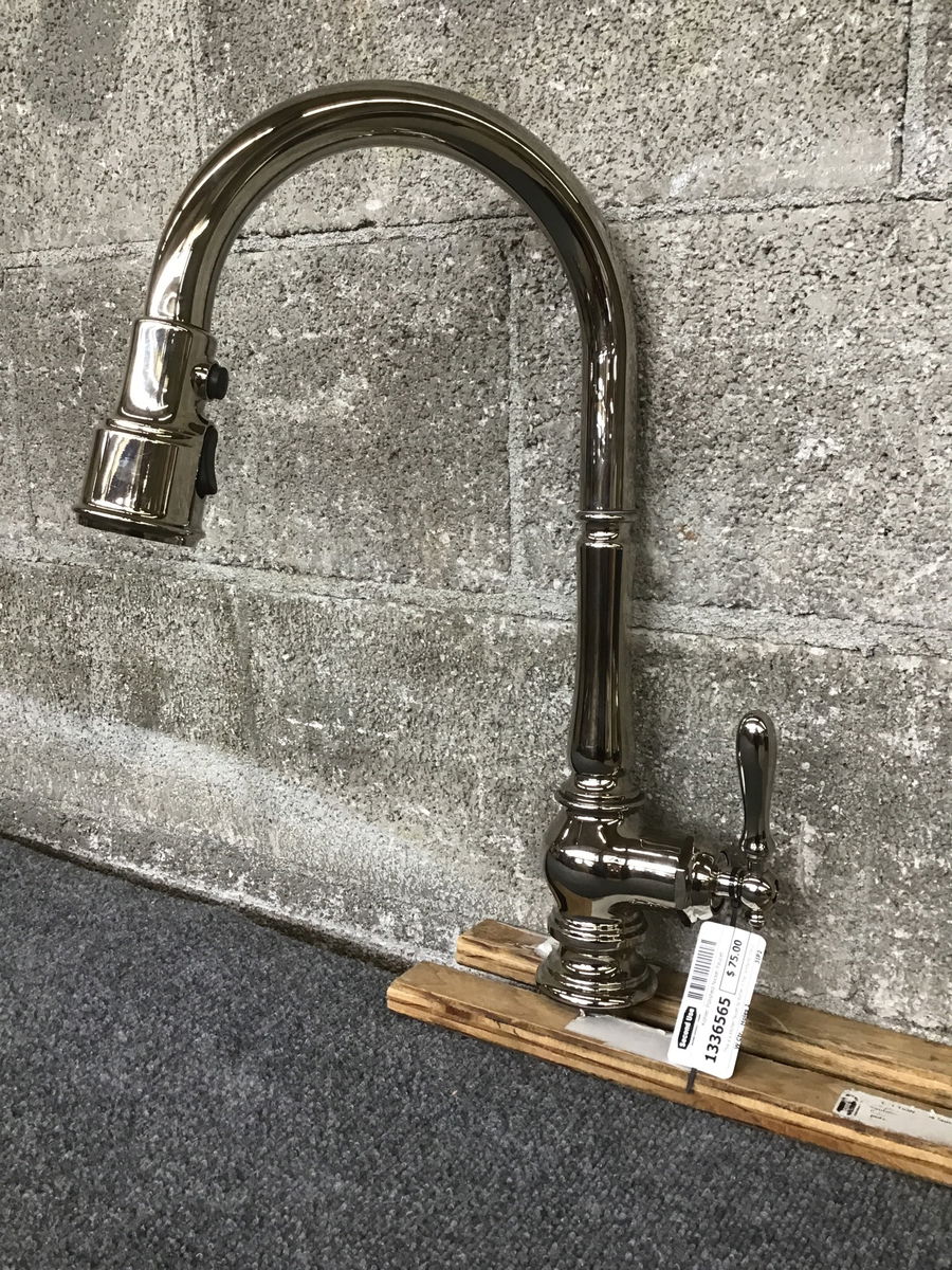 This is a kitchen faucet by Kohler in the "Artifacts" line of faucets. Has a vintage looking style but with modern functionality. Has a pull down sprayer head and is finished in polished nickel.