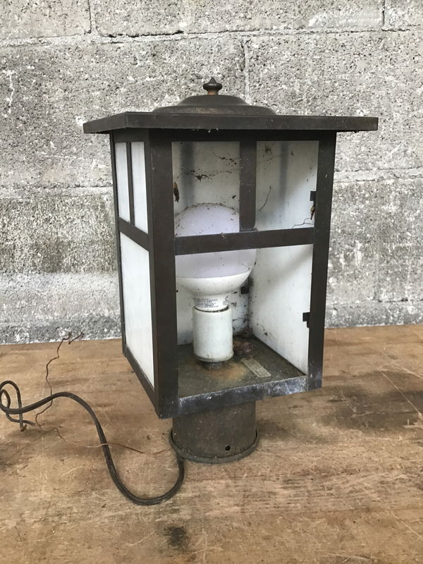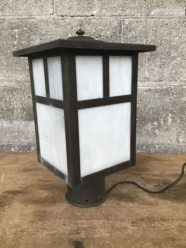Craftsman style post light, sans post, made by Arroyo Craftsman. Features a dark, oil-rubbed bronze finish and cloudy white glass. Comes with a surface-mount plate. Missing one pane of glass (point that side towards the wall...); price reflects.