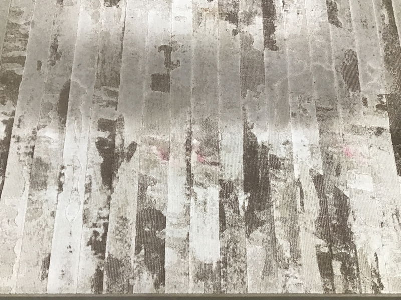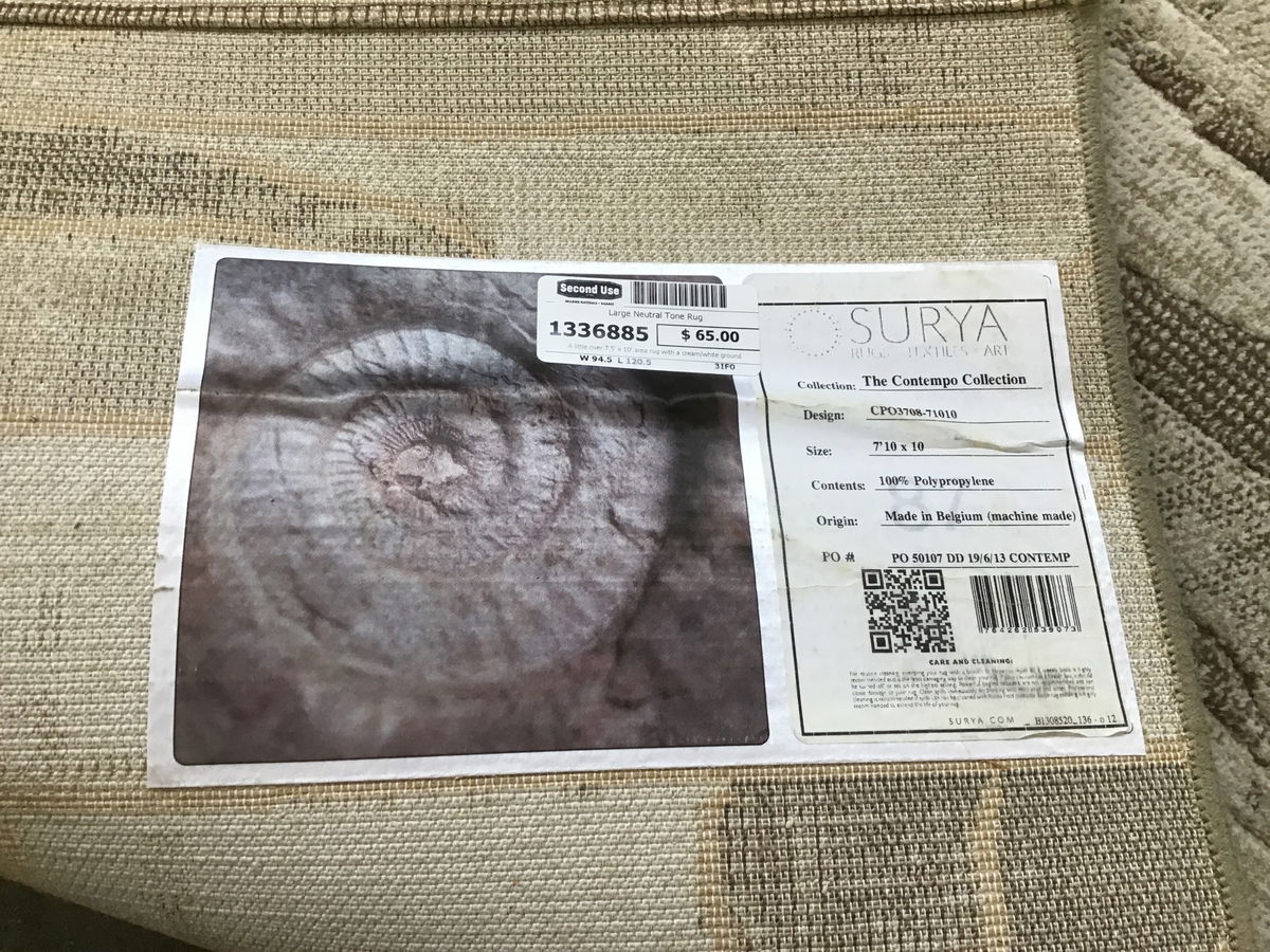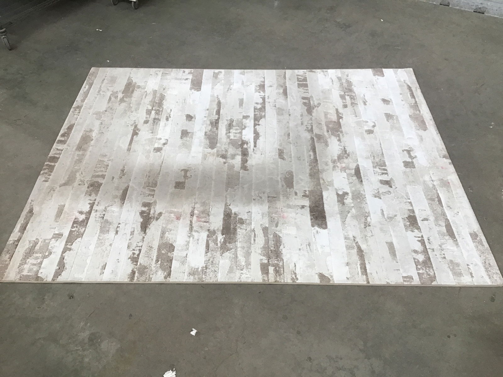 A little over 7.5' x 10' area rug with a cream/white ground and blotches of grey and brown all over. Has an interesting segmented texture to the pile. 100% polypropylene, made by Surya. Has some odd pink stains here and there, price reflects this and its need for a deep clean.