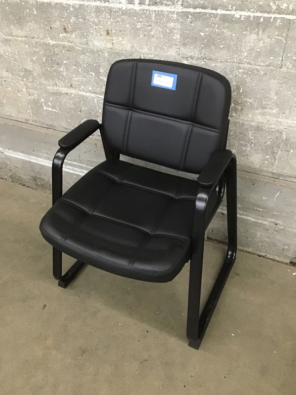 This is a black steel framed waiting room chair with black leather upholstery. Very clean, looks to have hardly ever been used.