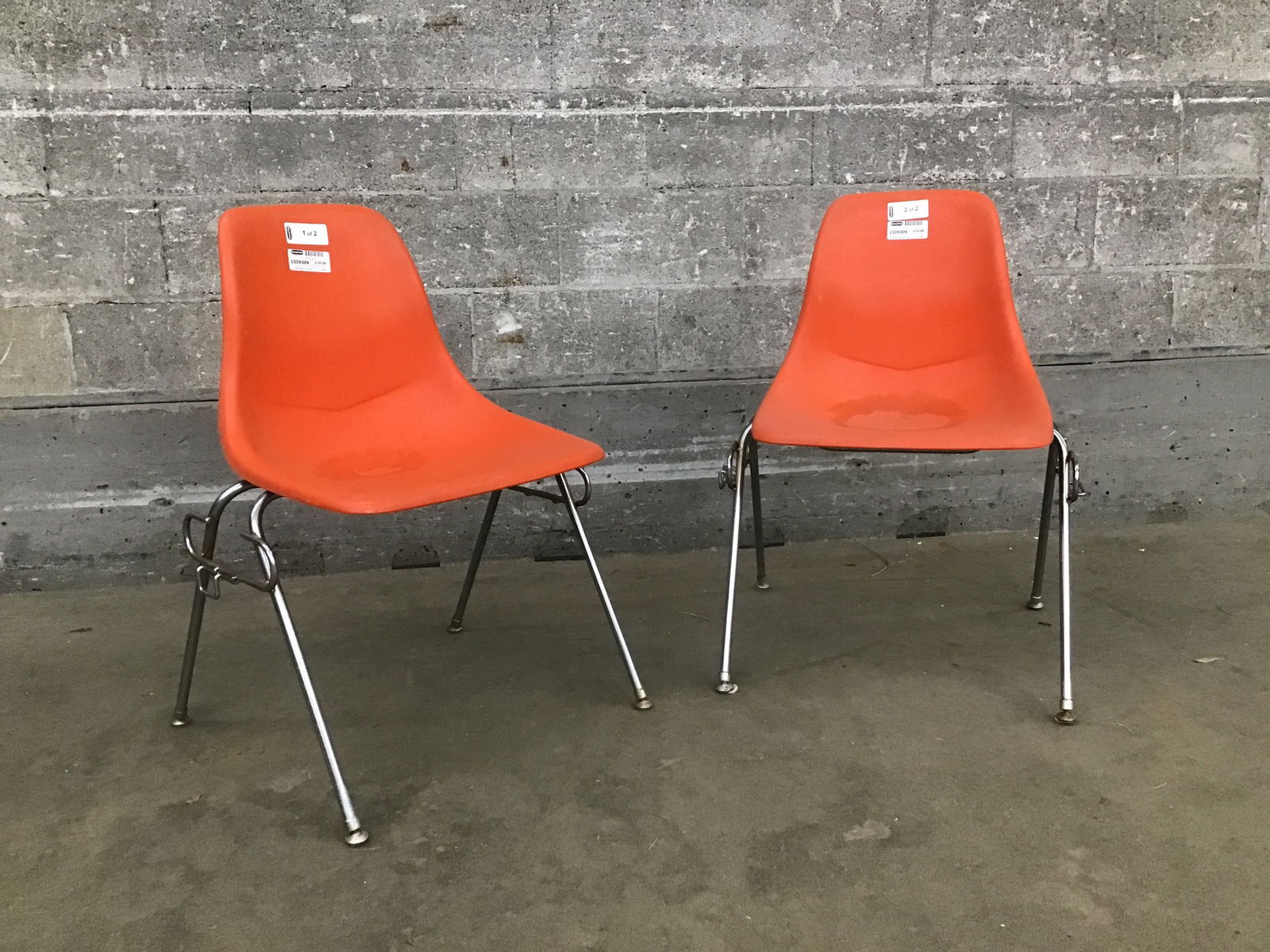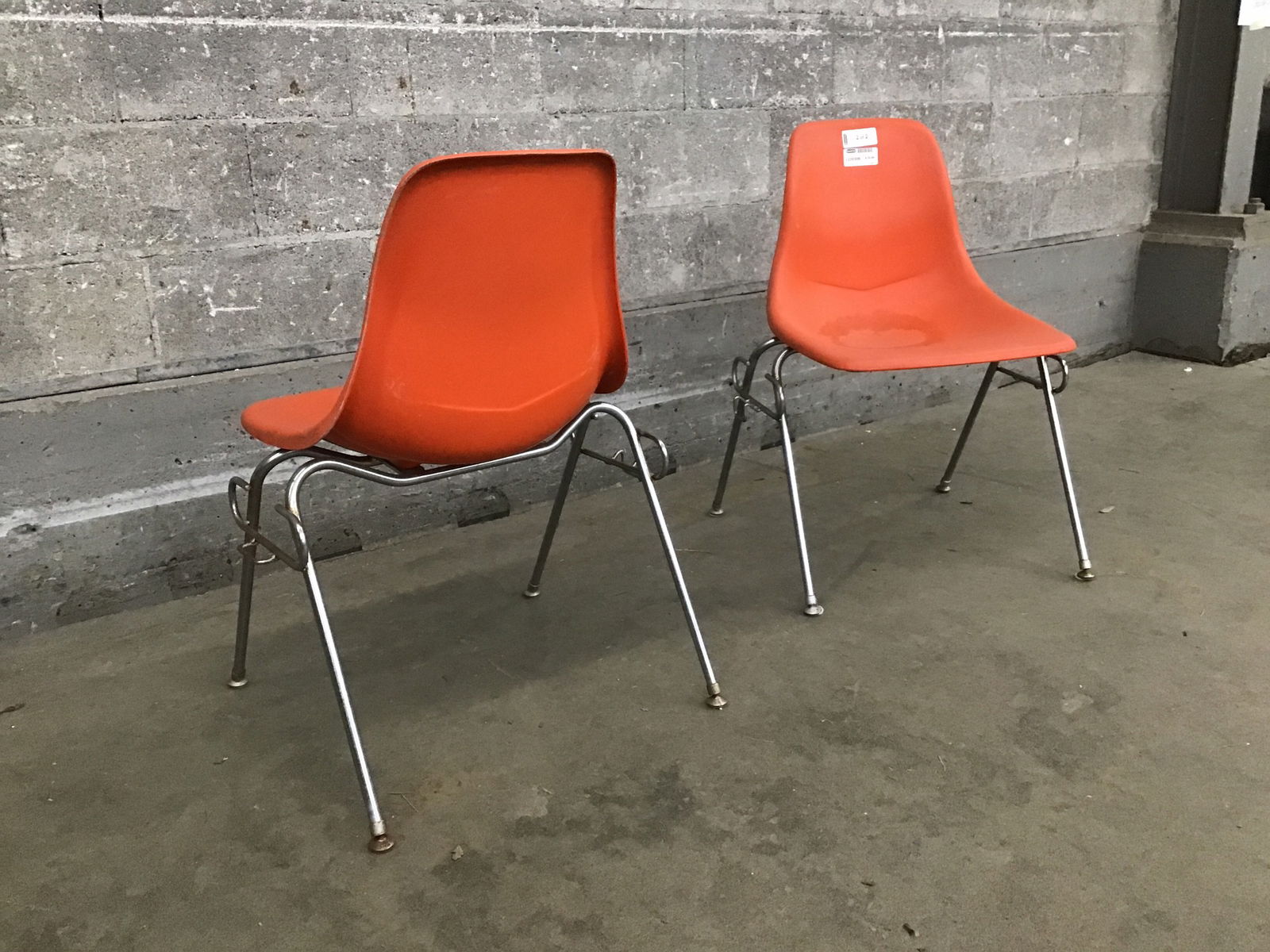 An adorable pair of stackable orange chairs that look like they may have come from a classroom, with a couple of little brackets on either side that look like they may attach to a desk of some sort.