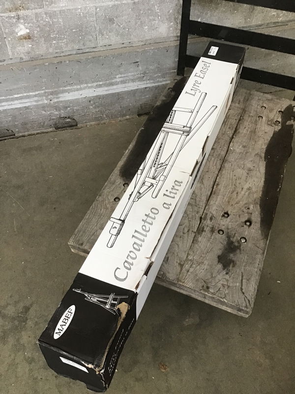 New in-box Mabef M11 Lyre easel constructed with oiled beech and heavy duty hardware. Can be adjusted and tilted to your liking to put your canvas exactly where you need it. Has a 2" tray for holding brushes and suches, and has a spring in the base to keep things steady. See it retailing at Blick on sale from $308!