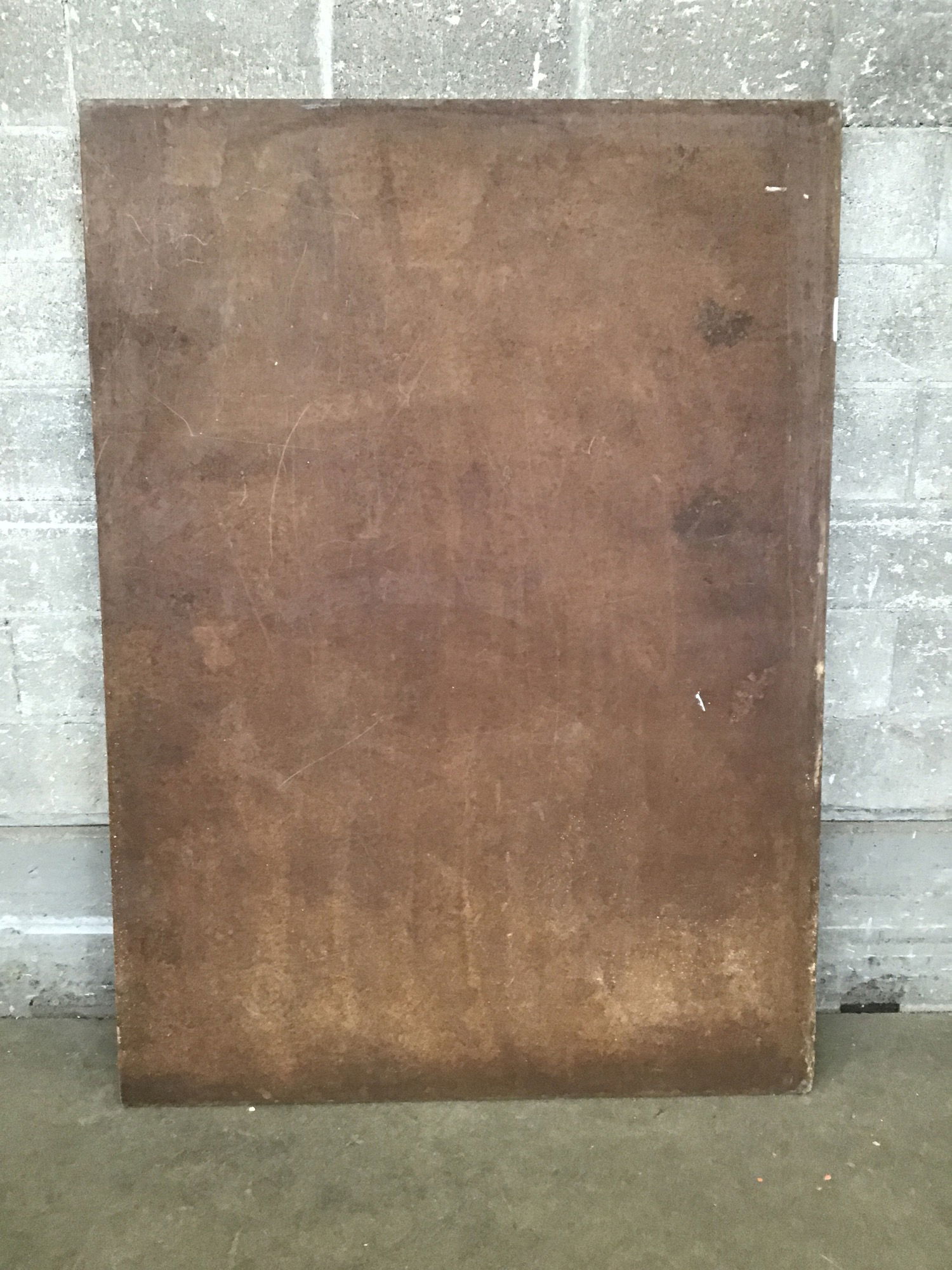 This is a large sheet of particle board with a brown masonite skin that would make a good work table top or something similar.