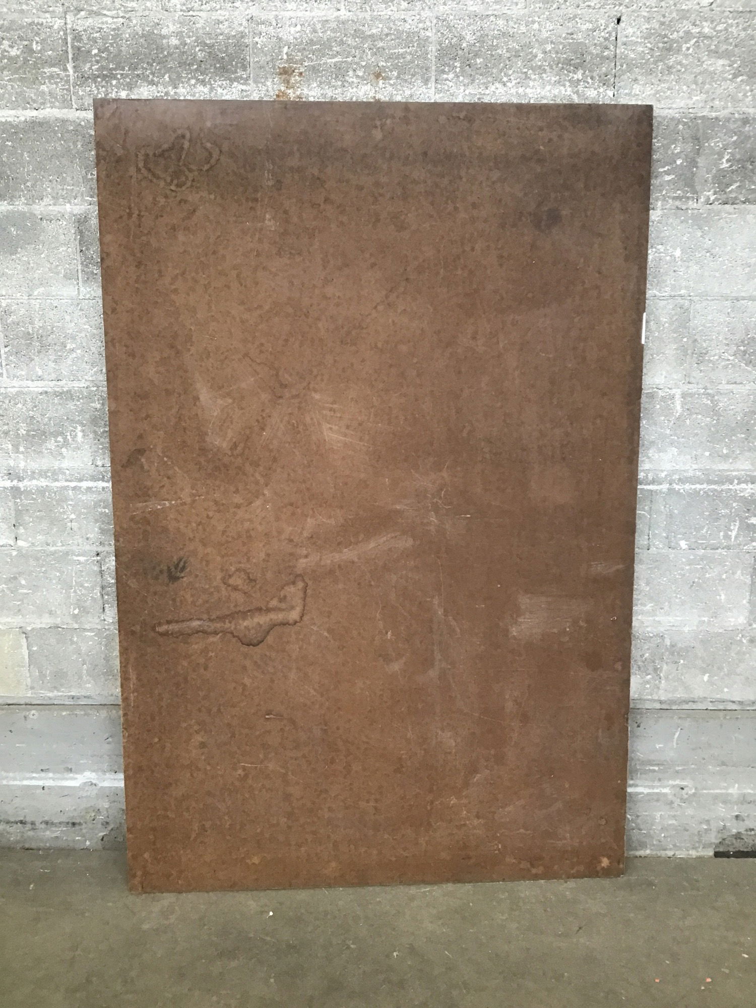 This is a large sheet of particle board with a brown masonite skin that would make a good work table top or something similar.