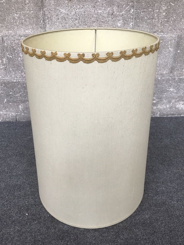 MCM lampshade with textured linen-like finish and bric-a-brac trim at the top.