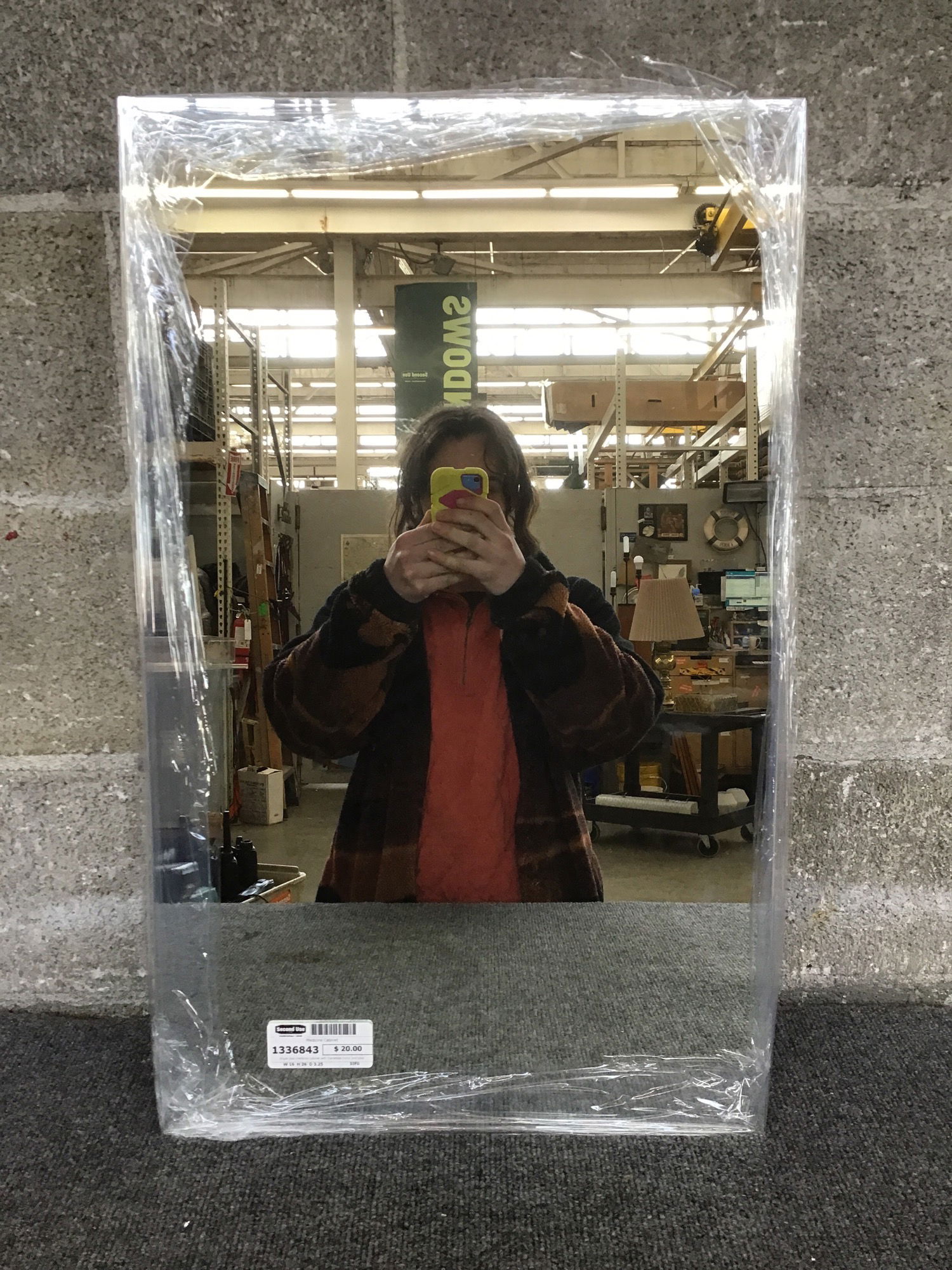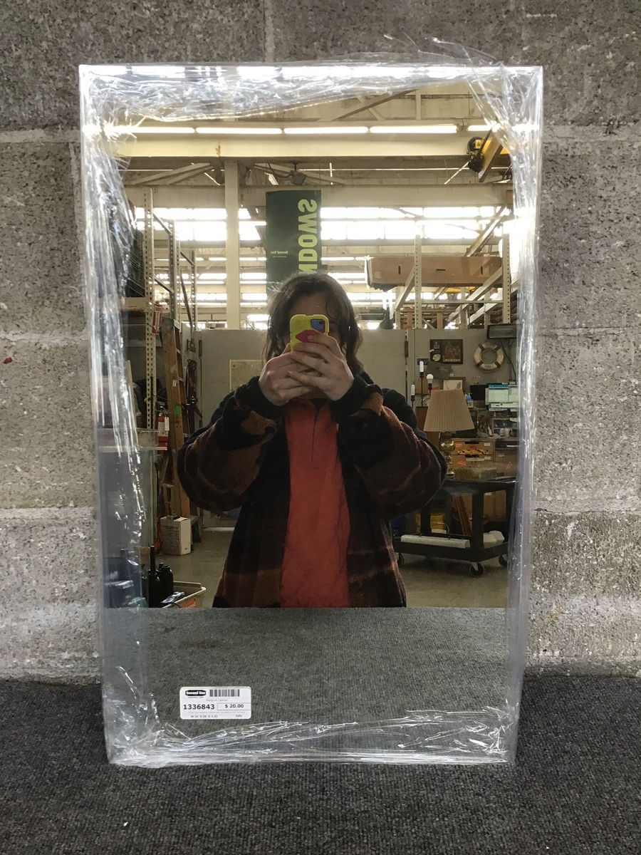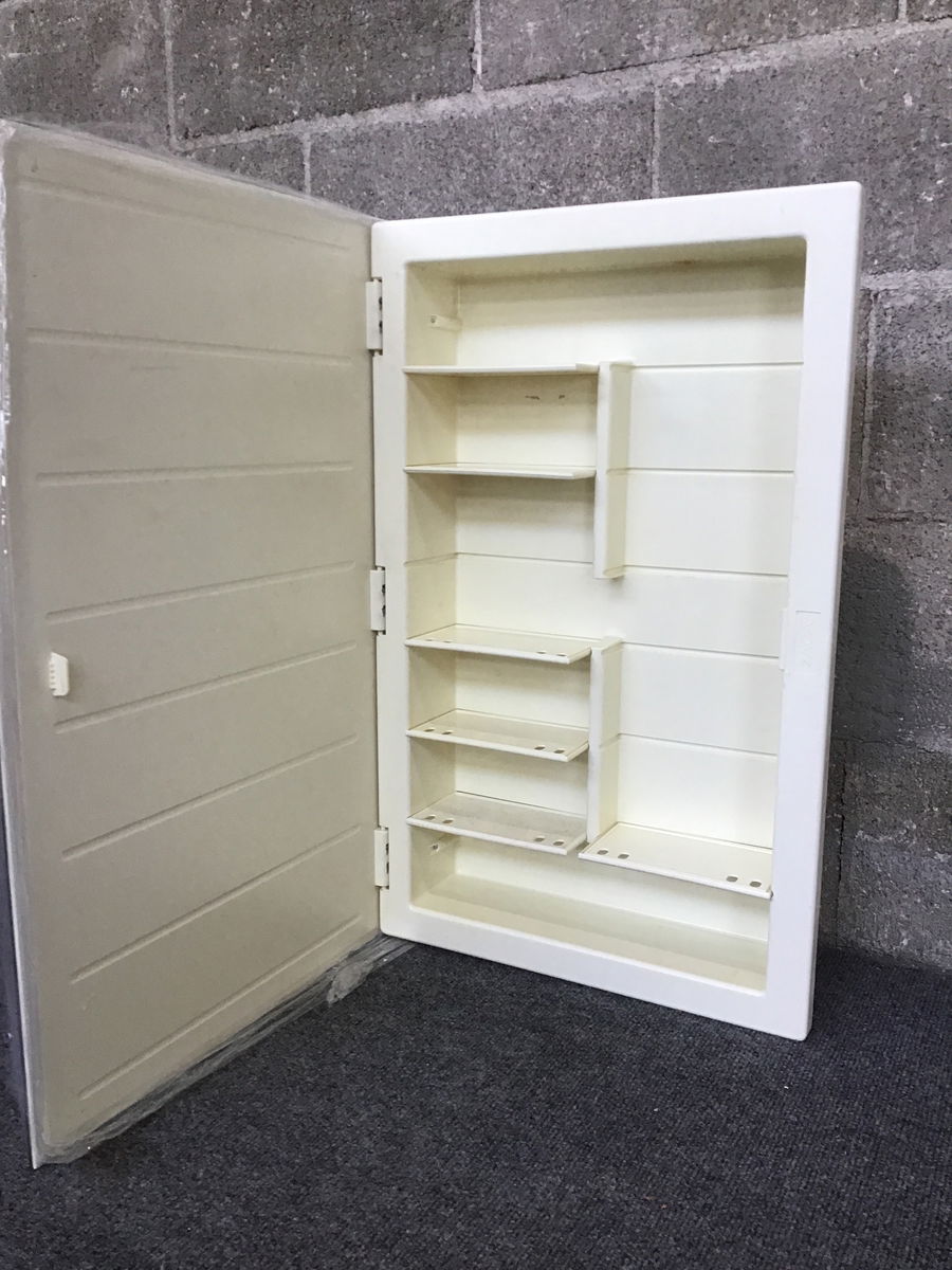 Single door medicine cabinet with frameless mirror and plastic box.