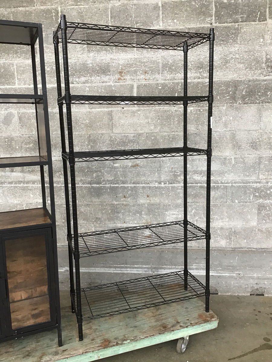 Black, vinyl coated metro rack with five adjustable shelves and leveling feet.